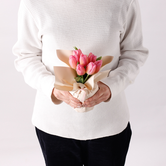 大口注文・法人のお問い合わせはこちら春の訪れを告げる愛らしいピンクのチューリップを、ふんわり柔らかなラッピングで包み込んだ「自立する花束」です。 エコゼリー入りで花瓶に移す手間がなく、届いてすぐに「春の特等席」として飾っていただけます。 場所を選ばず、忙しい方へのギフトや自分へのご褒美にも最適。陽だまりのような温もりと、心ほころぶ旬の彩りを、大切なあの方の日常へお届けしませんか。