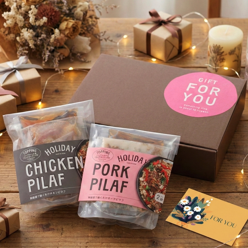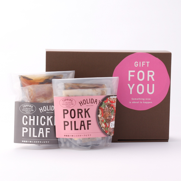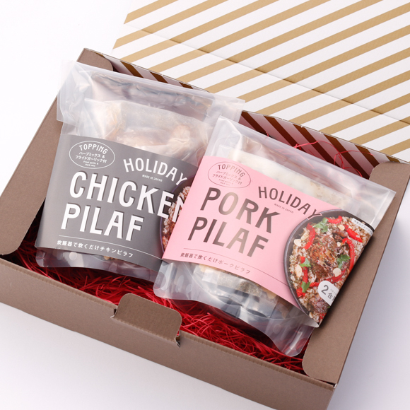 大口注文・法人のお問い合わせはこちらお米と一緒に炊飯器に入れるだけ。驚くほど簡単に、テーブルを華やかに彩る贅沢ピラフが完成します。ホームパーティーやおもてなしにぴったりな一品です。 <セット内容> ・ポークピラフ ・チキンピラフ ・選べるギフトボックス