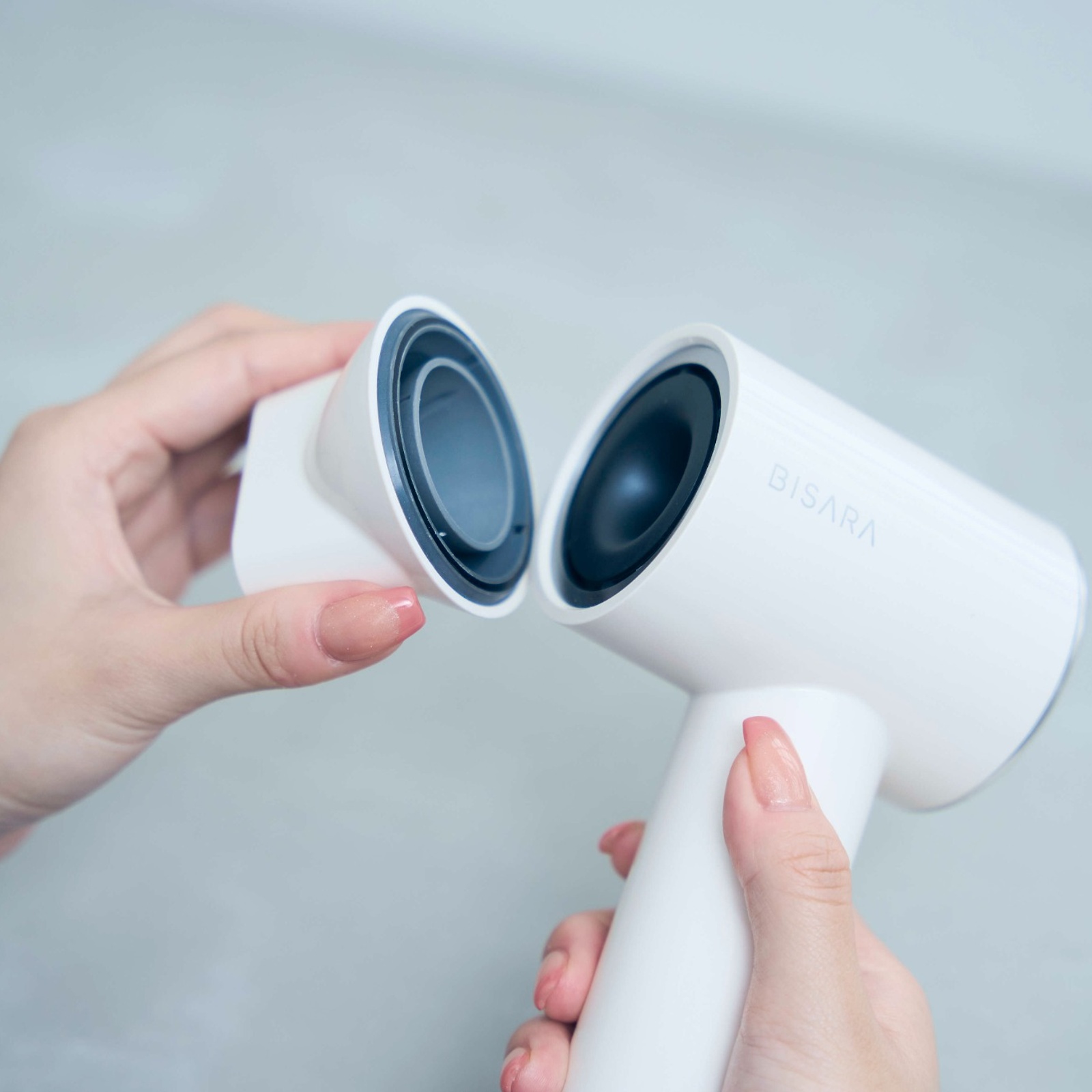 BLDCモーターの採用により、コンパクトサイズながら毎分約10万回転の強力な風を実現。小さなボディでも驚くほどの大風量を発揮し、短時間で効率的に乾かします。