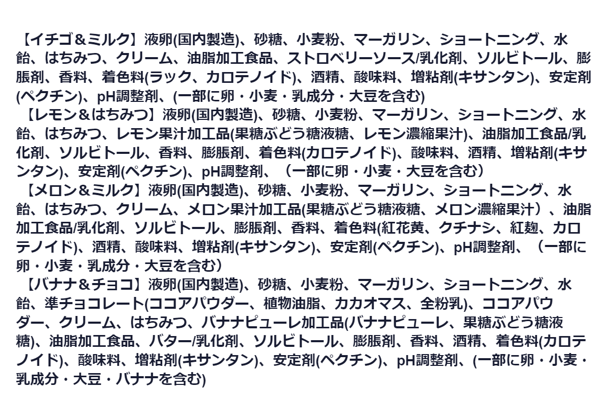 | 銀座フルーツクーヘン | 【原材料】 別途記載 【アレルゲン情報】 卵・小麦・乳成分・大豆・バナナ 【賞味期限/消費期限】 製造日より120日 【内容量/数量】 イチゴ&ミルク、レモン&はちみつ、メロン&ミルク、バナナ&チョコ 各2個 /計8個 【外装サイズ】 幅26cmX縦20.5cmX高さ5cm |