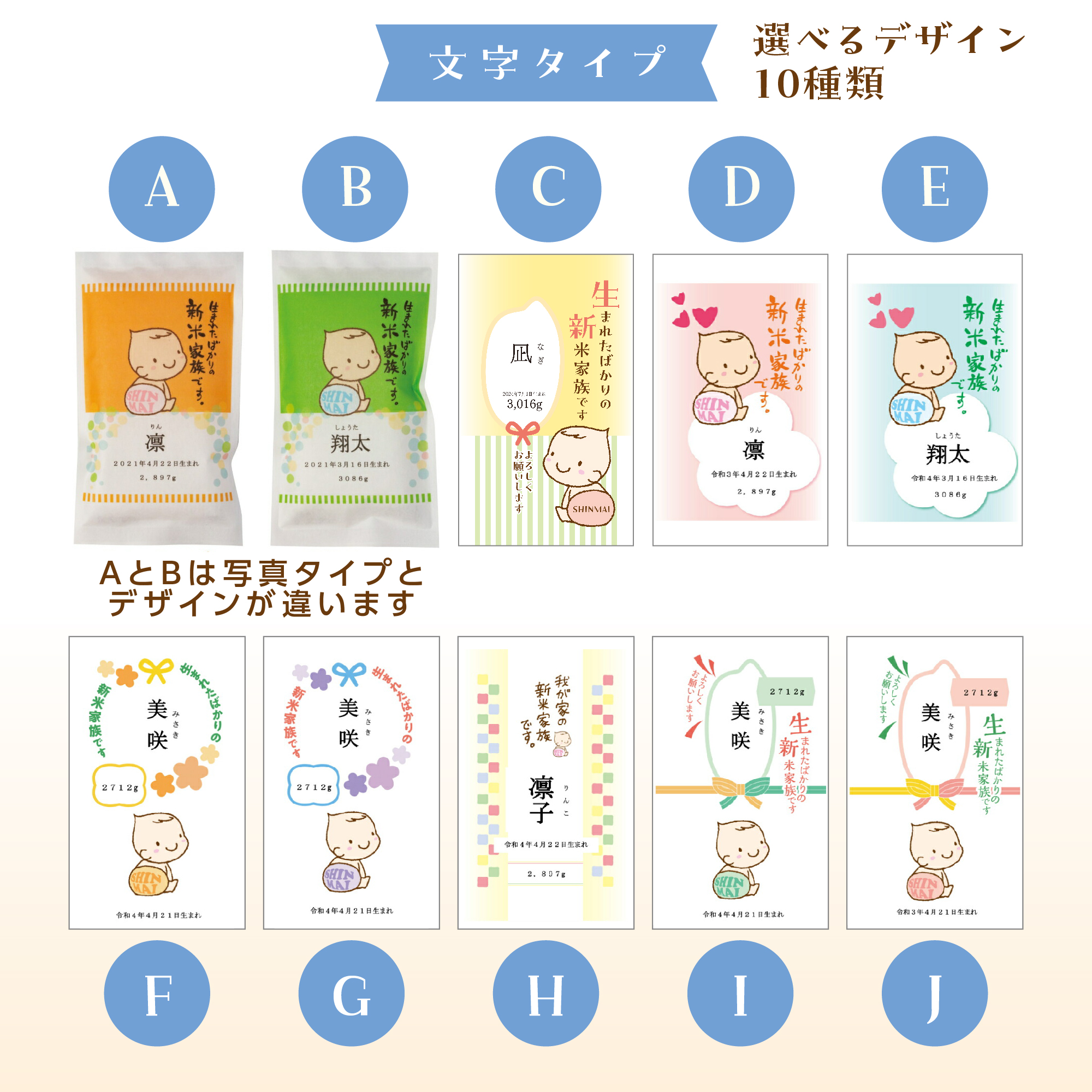 パッケージには、生まれたばかりの赤ちゃんのお名前を入れることができます。 「新米家族です。どうぞよろしくね。」そんな愛らしいメッセージが伝わる、10種の豊富なデザインからお選びいただけます。受け取った方が思わず笑顔になる、サプライズです。