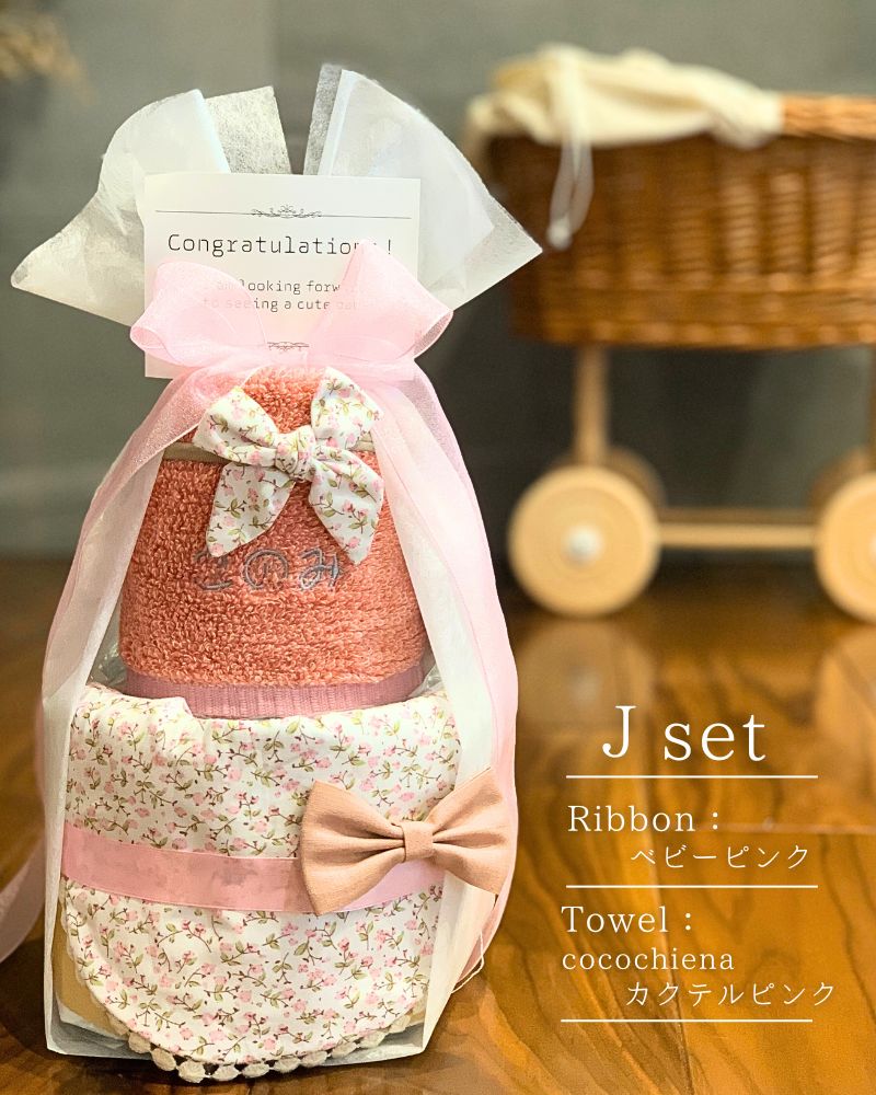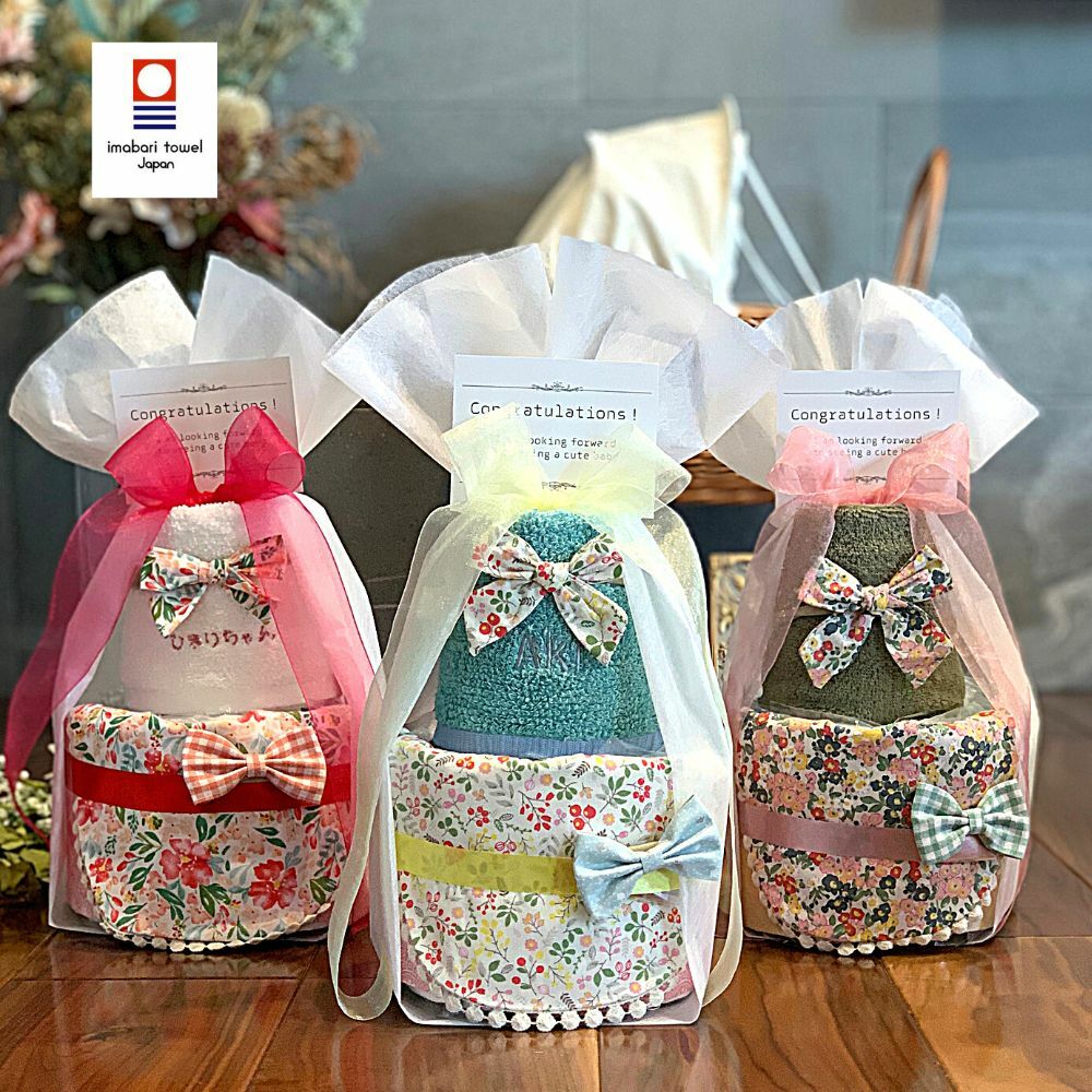 リバーシブルの女の子用スタイとヘアバンドを選んで組み合わせオリジナルのおむつケーキを。タオルにはお名前の刺繍もできます。