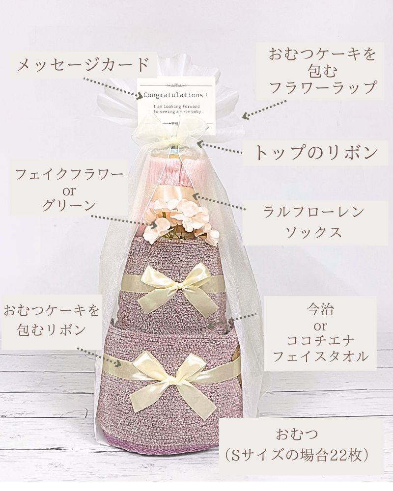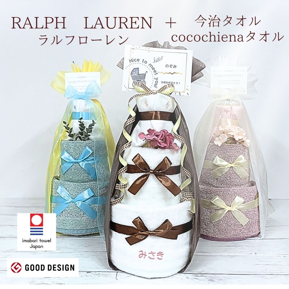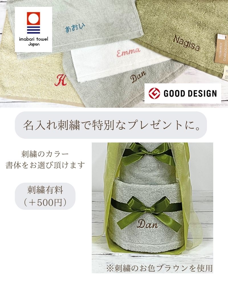 タオルはグッドデザイン賞を受賞したココチエナタオル又は日本が誇る高品質の今治タオルのどちらかをお選びいただけます。リボンのお色やフラワーラップのお色などお選びいただけます。タオルに名入れ刺繍をして特別なプレゼントに。