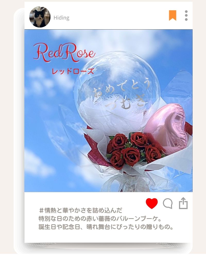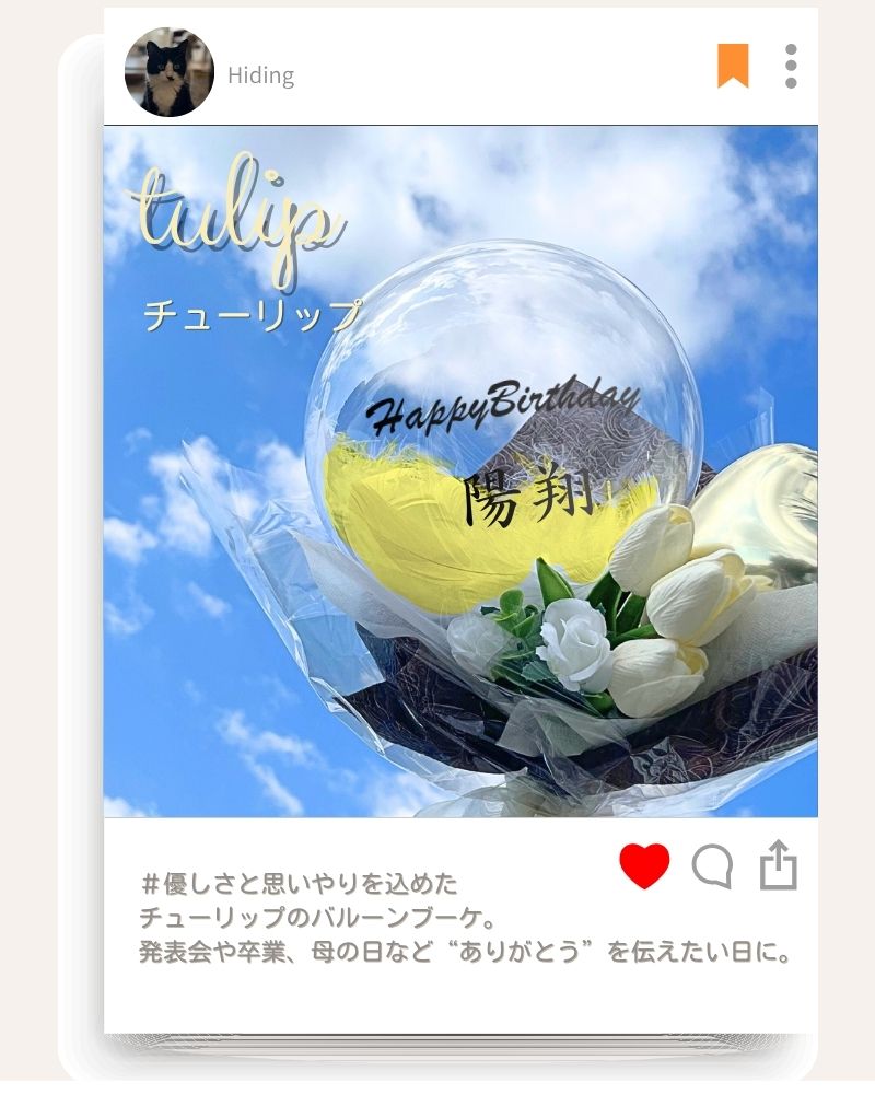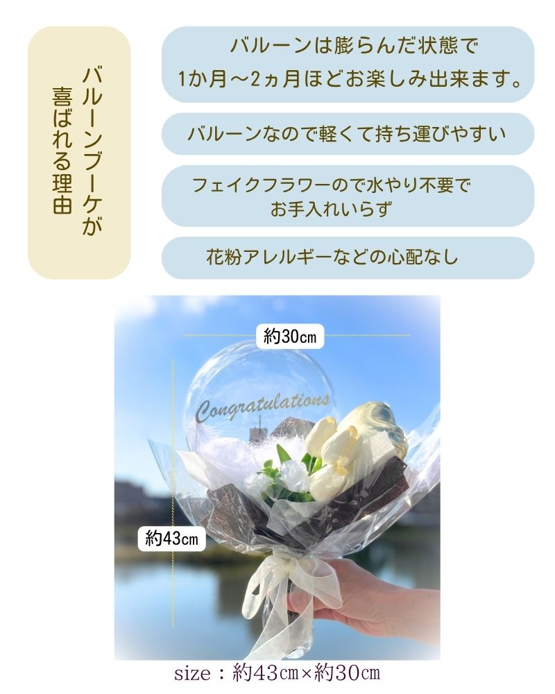 大口注文・法人のお問い合わせはこちら世界に一つだけの名入れバルーンで、忘れられない感動を贈りませんか? 箱を開けた瞬間の驚きと笑顔は、最高の思い出に。 お手入れ不要の美しいブーケが、お祝いの気持ちと共にずっと寄り添います。
