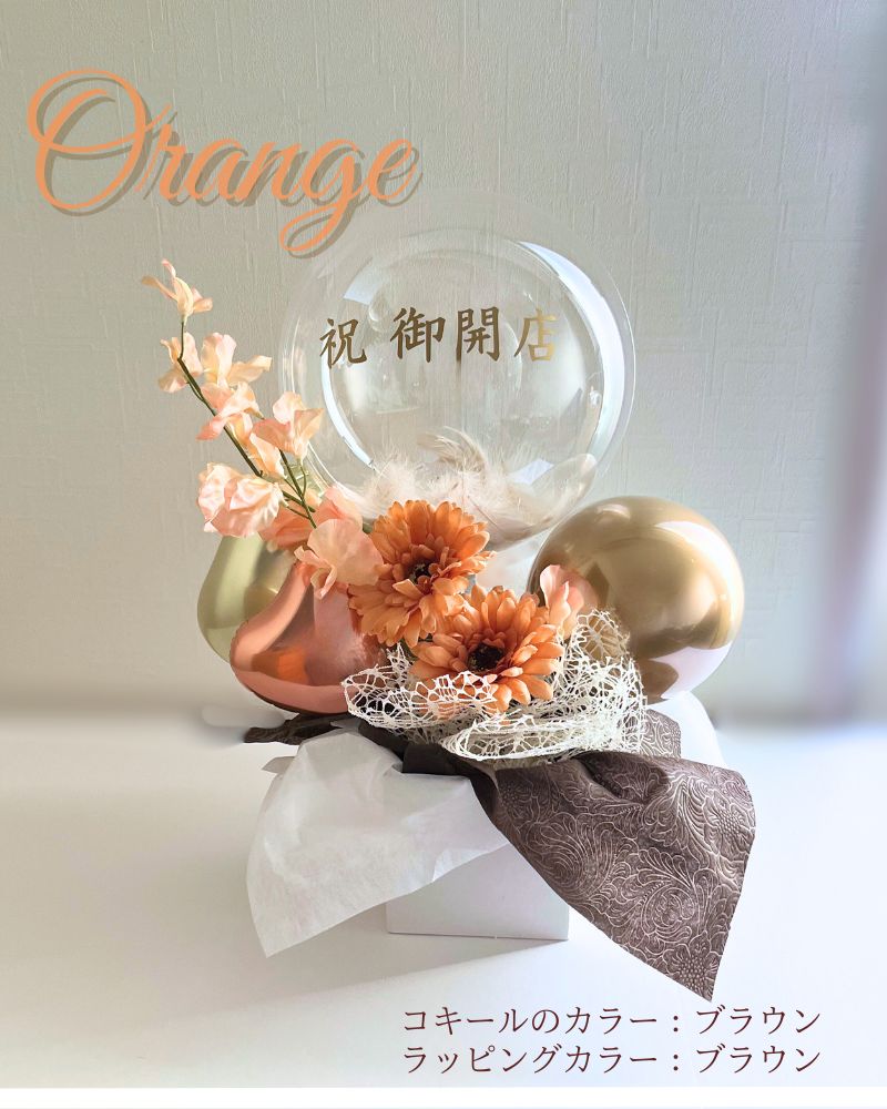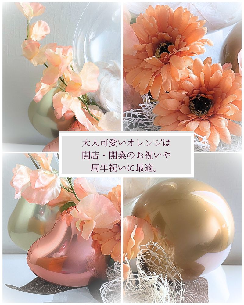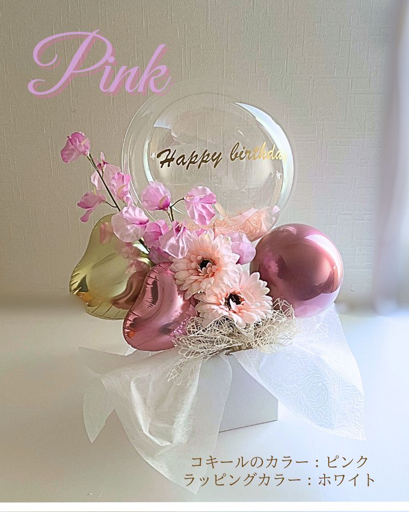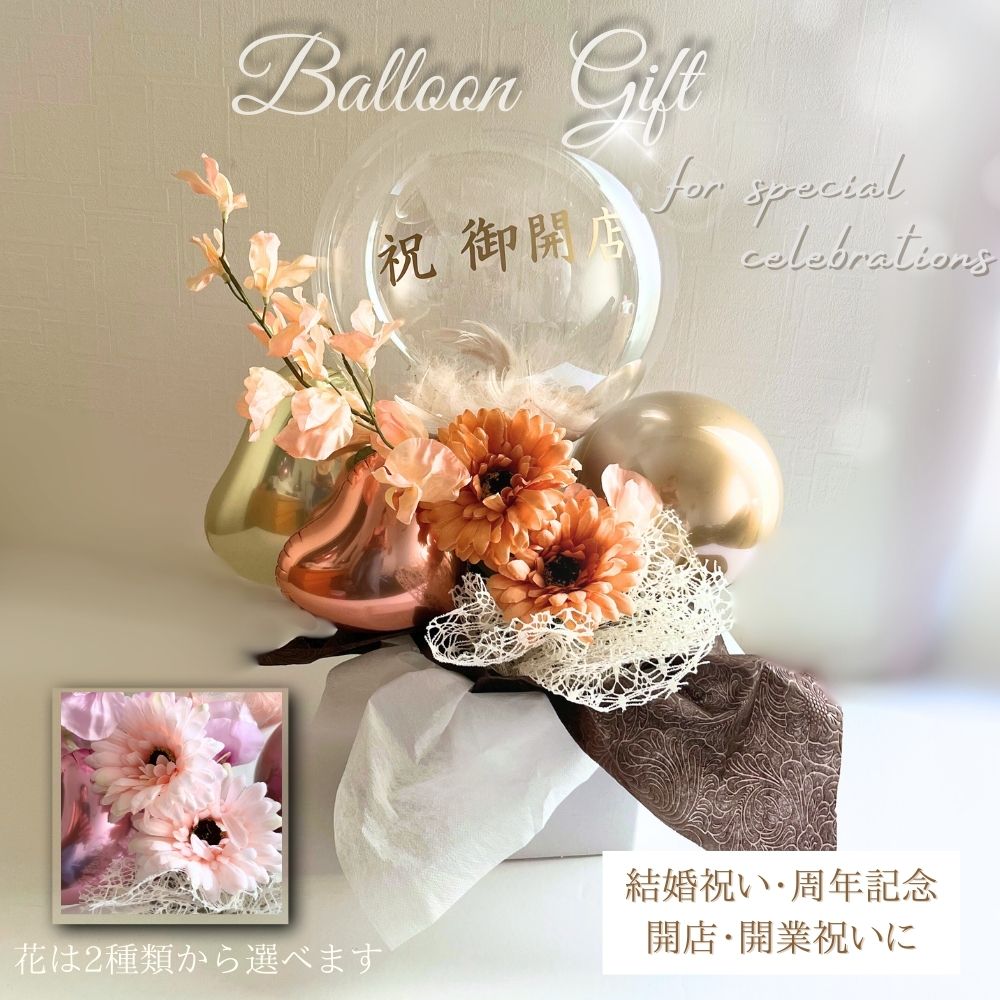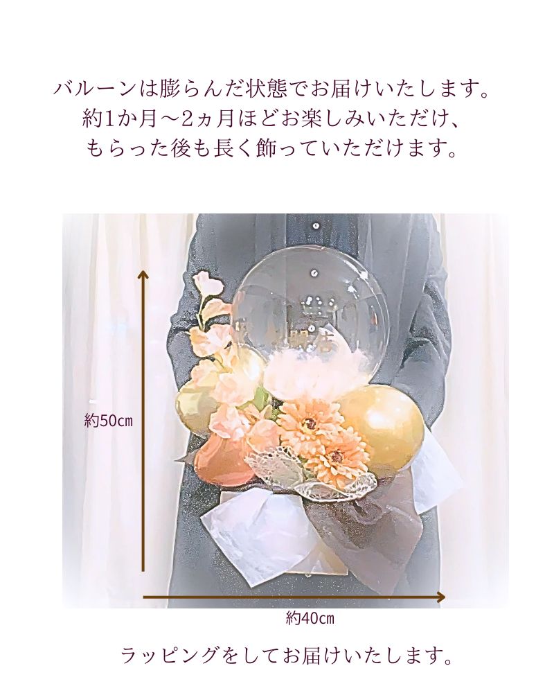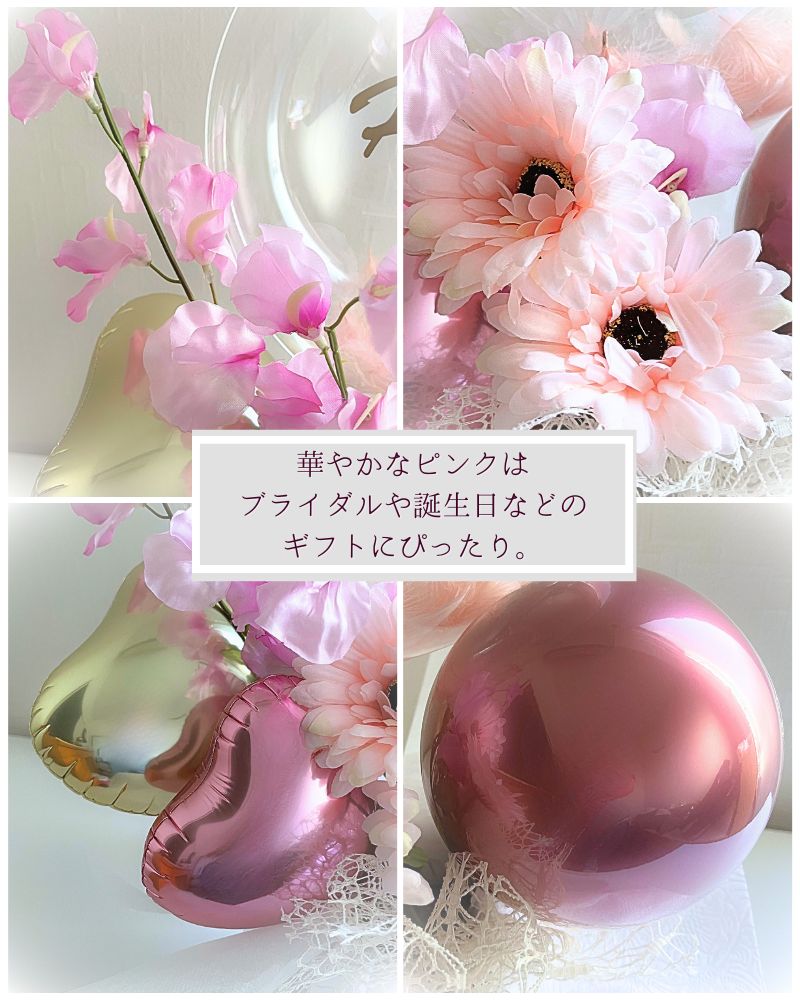 バルーンにはたっぷりの羽が入っています。お好きな羽のカラーをお選びください。フェイクフラワーなのでお手入れ不要で花粉アレルギーなどの心配なし。バルーンにお名前やメッセージを入れして特別な贈り物に。