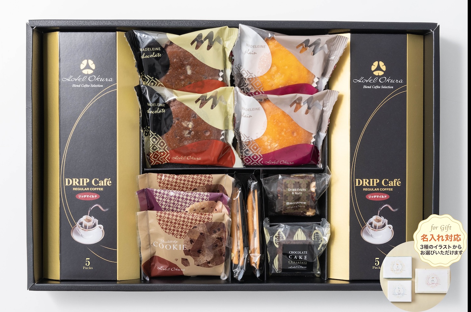 | 内容量 | マドレーヌ(プレーン・チョコ)・レーズンサンド・チョコチップクッキー・ドリップ珈琲リッチマイルド40g(8g×5袋)×各2個、ブラウニードライフルーツ&ナッツ・レーズンクッキー・チョコレートケーキ×各1個 |
