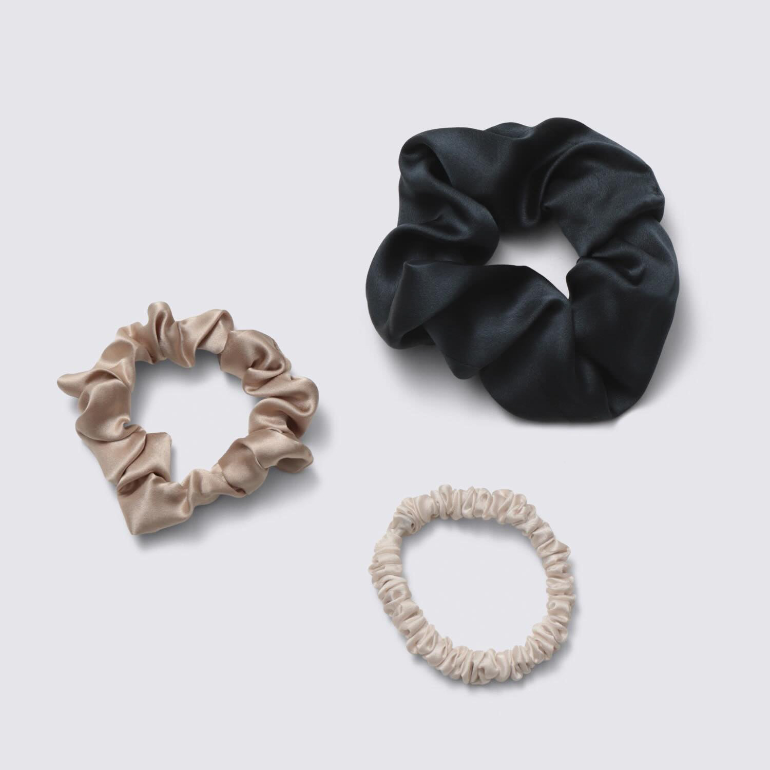大口注文・法人のお問い合わせはこちら最高品質のシルクを100%使用したシルクシュシュ。 シルクは髪に優しい素材なので結び目の跡が付きにくく、長時間結んでいることによる髪の摩擦ダメージも軽減してくれます。 3つのサイズがセットとなっており、気分やコーディネートに合わせた使い分けをお楽しみいただけます。