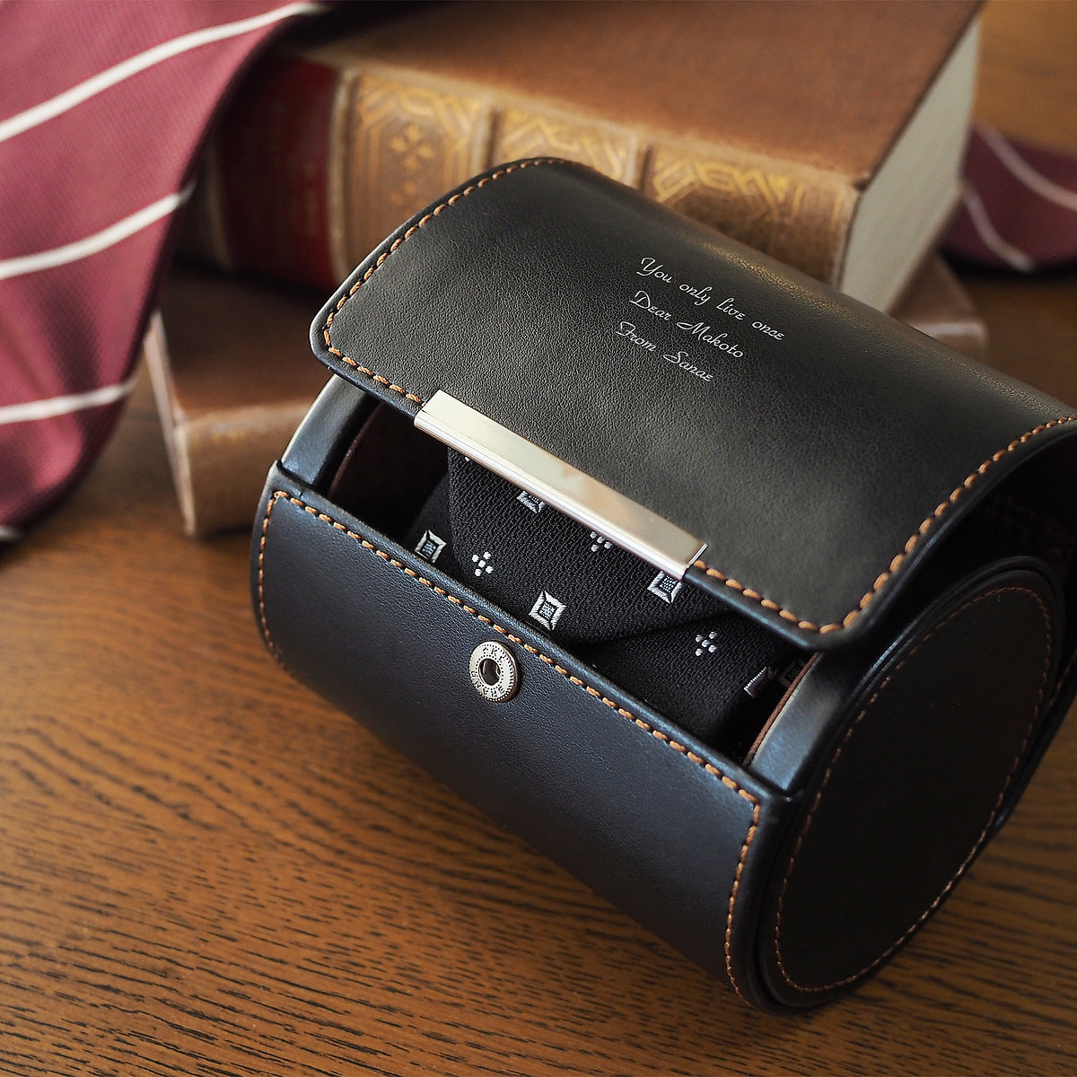出張先でもスタイルをエレガントに保つ、ネクタイ&ウォッチケースです。蓋に特別なメッセージを刻むことができます。実用性と洗練されたデザインを兼ね備え、誕生日や昇進祝いなど、心からの祝福を伝える贈り物におすすめです。