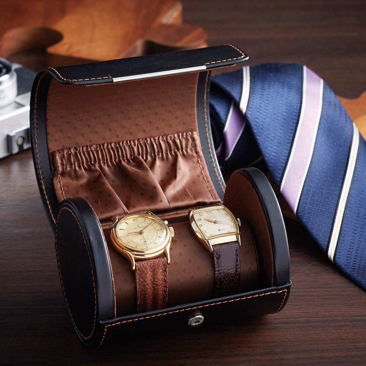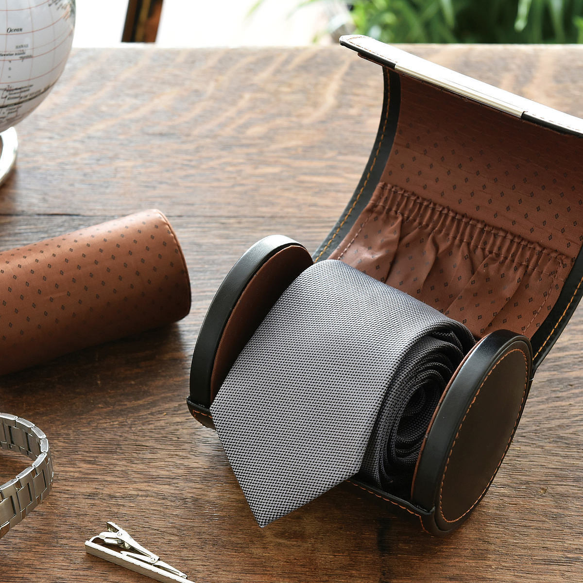 柔らかなクッションで、大切な腕時計を優しく包み込むウォッチケースに。クッションを外せば、くるりと丸めたネクタイがすっきりと収まります。蓋の裏には、ネクタイピンやカフスを忍ばせるポケットも完備。上質な合成皮革の質感が、品格を引き立たせてくれるデザインです。