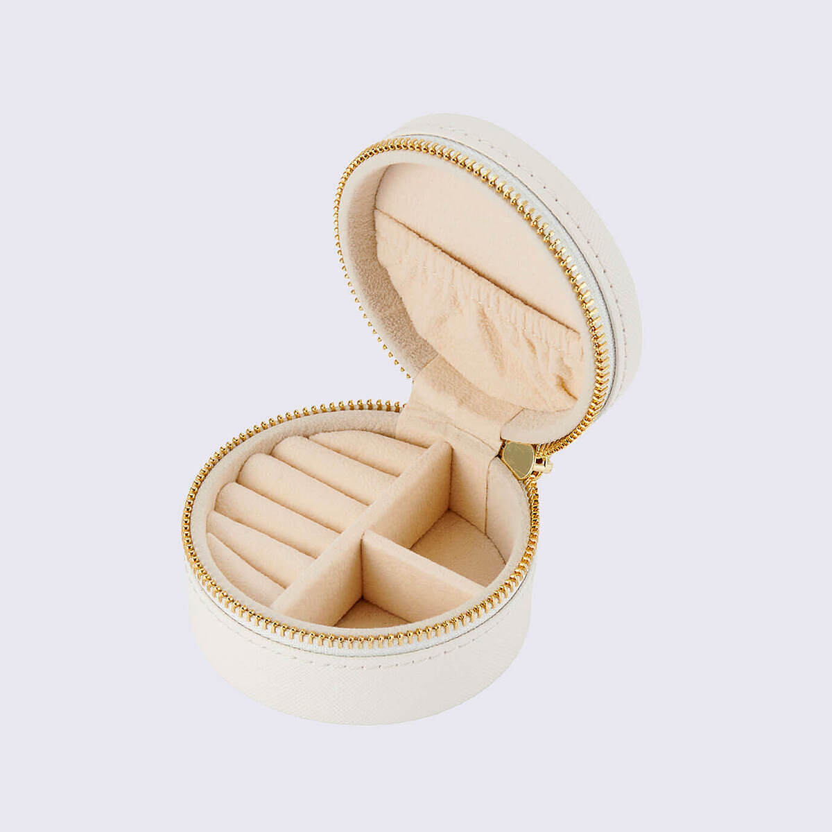 持ち運びに便利なコンパクトさながら、5列のリングホルダー、チェーンが絡まないゴム付きポケット、自由に使えるフリースペースなど、アクセサリーをきれいに収めることができます。
