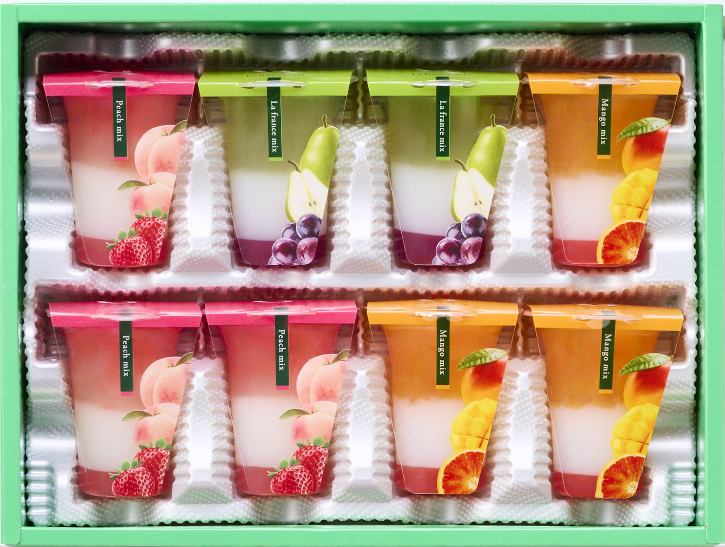 | 原材料 | <ピーチミックス味> 砂糖 (国内製造)、水あめ混合異性化液糖、桃ピューレ、濃縮桃果汁、乳製品乳酸菌飲料 (殺菌)、発酵乳 (殺菌)、洋酒、りんごピューレ、加糖練乳、濃縮りんご果汁、さくらんぼ果汁、濃縮いちご果汁、寒天、本わらび粉/ゲル化剤(増粘多糖類)、pH調整剤、乳酸カルシウム、香料、酸化防止剤(V.C)、酸味料、着色料(カロテノイド)、(一 部に乳成分・大豆・もも・りんご・ゼラチンを含む) <マンゴーミックス味> 砂糖(国内製造)、水あめ混合異性化液糖、桃ピューレ、乳製品乳酸菌飲料 (殺菌)、発酵乳(殺菌)、洋酒、マンゴー加工品、加糖練乳、濃縮りんご果汁、ブラッドオレンジ果汁、パイナップル果汁、寒天、本わらび粉/ゲル化剤(増粘多糖類)、pH調整剤、香料、乳酸カルシウム、酸化防止剤(V.C)、着色料(カロテノイド)、酸味料、(一部に乳成分・オレンジ・大豆・もも・りんご・ゼラチンを含む) <ラ・フランスミックス味> 砂糖(国内製造)、水あめ混合異性化液糖、濃縮西洋なし果汁、濃縮り んご果汁、乳製品乳酸菌飲料(殺菌)、還元水飴、発酵乳(殺菌)、洋酒、加糖練乳、ぶどう果汁、寒天、本わらび粉/ゲル化剤(増粘多糖類)、pH調整剤、乳酸カルシウム、香料、着色料(アントシアニン、クチナシ、カロテノイド)、酸化防止剤(V.C)、(一部に乳成分・大豆・りんご・ゼラチンを含む) |