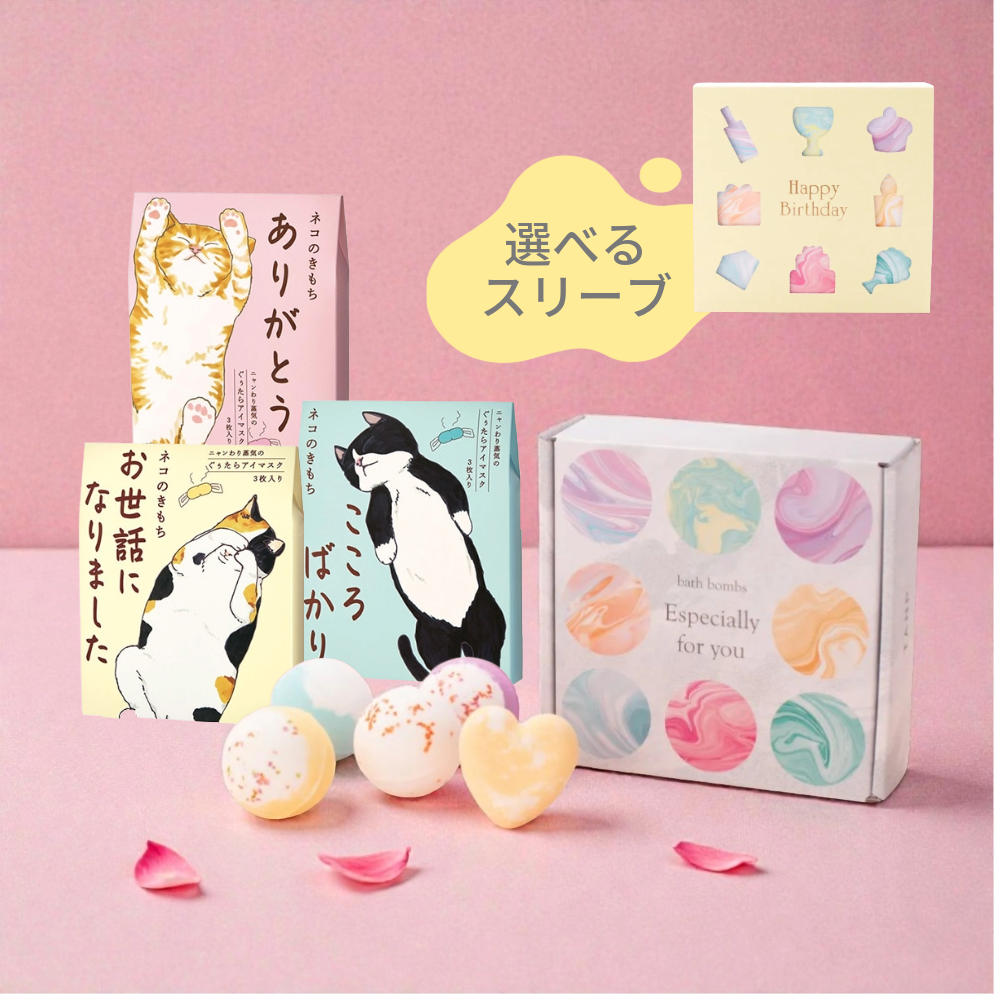 大口注文・法人のお問い合わせはこちらギフト専門バイヤーがプレゼントに特化して作ったTANPオリジナルバスボムと、目元をやさしく包み込む猫のホットアイマスクをセットにしました。 毎日頑張っている大切な方へ、癒しのひとときを贈りませんか。 <セット内容> ・カラフルバスボム9個 ×1 ・猫ホットアイマスク3枚入 ×1