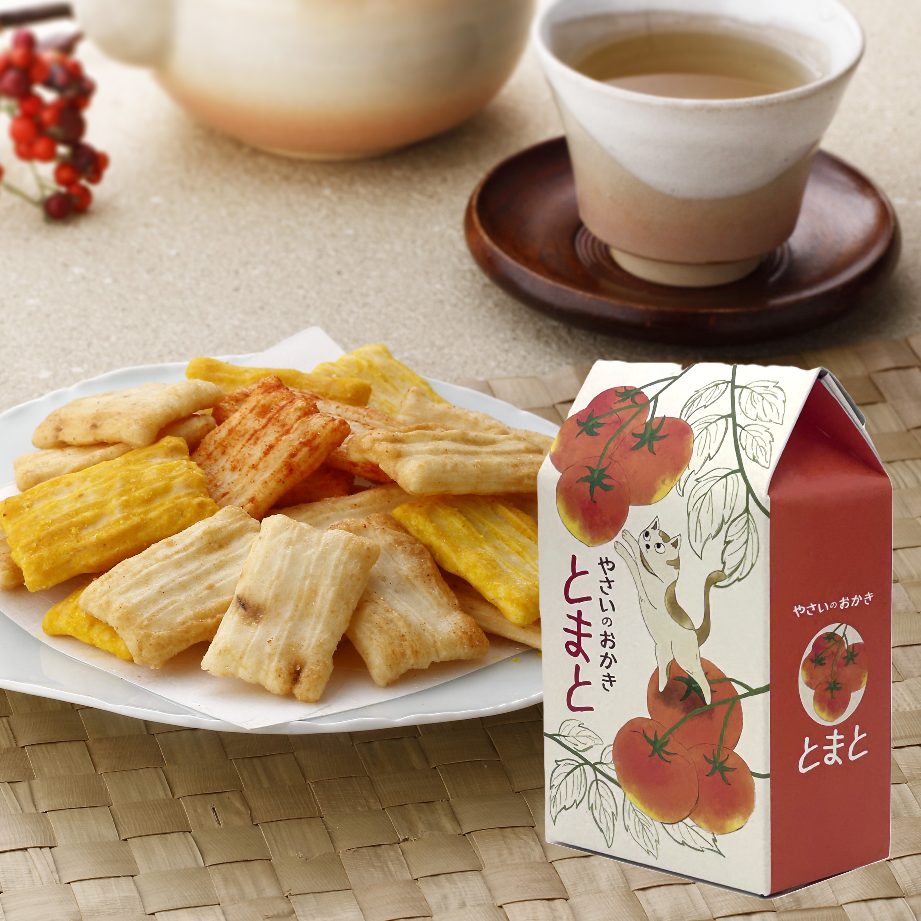 可愛らしい猫のパッケージに、とまと味のおかきを詰合せました。自分用としてはもちろん、気軽に贈るプチギフトにもおすすめ。便利な個包装でシェアもしやすく、日々の感謝を伝えるギフトにぴったりです。