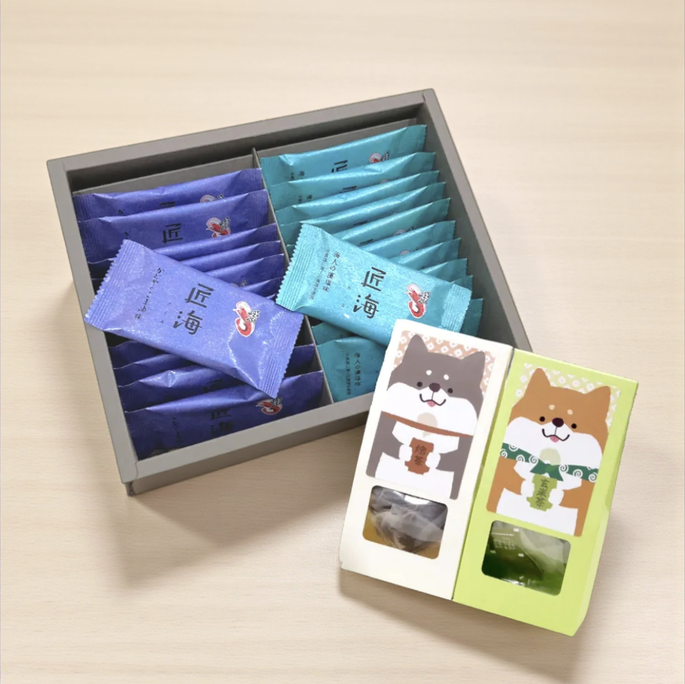 瀬戸内海の天然えびと海人の藻塩、老舗のごま油をそれぞれ使用した、プレミアムかっぱえびせんと選べるお茶のセットです。お茶は4種類からお選びいただけます。世代や性別を問わず喜んでいただけるギフトです。