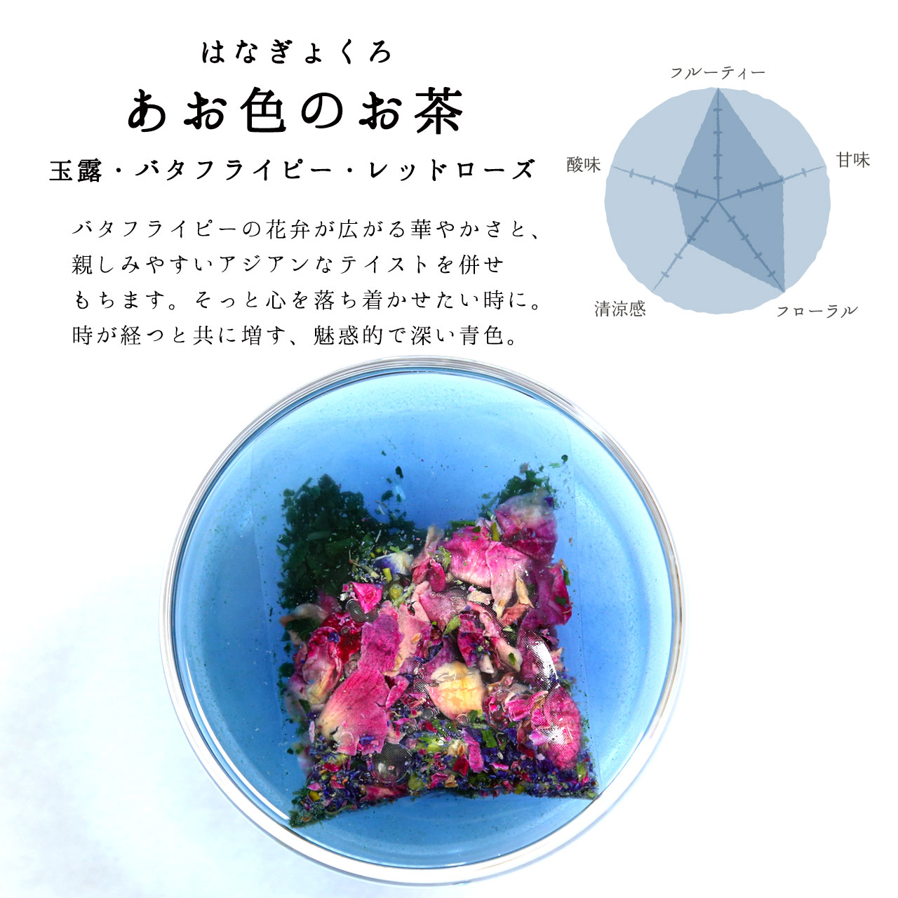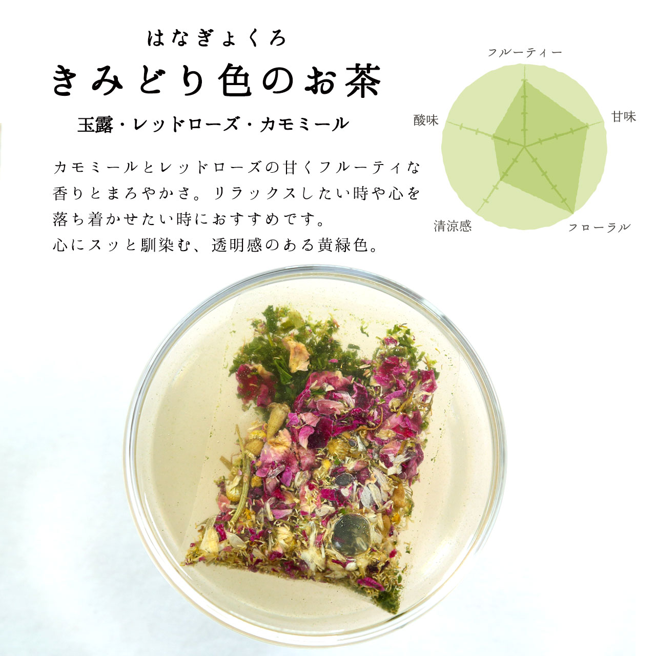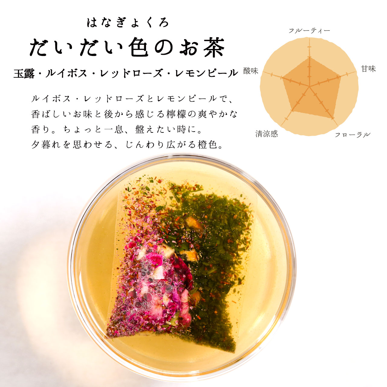 | wonderful week tea | 【外装サイズ】 幅8.8cm×奥行4.5cm×高さ12cm 【賞味期限/消費期限】 ・京玉露、京和紅茶、京ほうじ茶:6ヶ月 ・はなぎょくろ各種:3ヶ月 【購入者最低保証残存賞味期限 】 30日 【内容量/原材料】 ・6g(2g×3袋) 京玉露:緑茶(国産) 京和紅茶:茶(国産) 京ほうじ茶:緑茶(国産) ・8g(2g×4袋) あお色のお茶:緑茶(国産)、バタフライピー、レッドローズ だいだい色のお茶:緑茶(国産)、ルイボス、レッドローズ、レモンピール きみどり色のお茶:緑茶(国産)、カモミール、レッドローズ あか色のお茶:緑茶(国産)、ハイビスカス、カモミール |