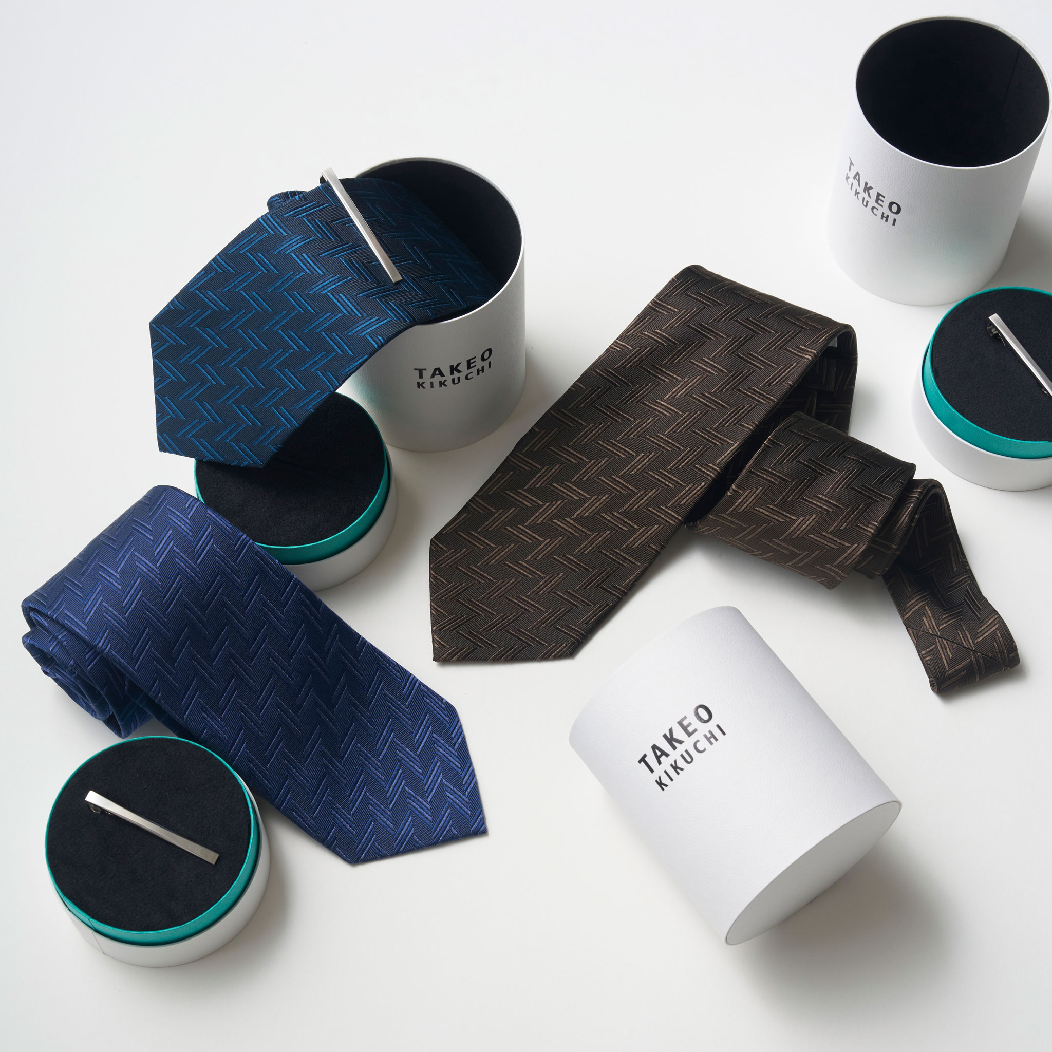 端正な一本にシャープな輝きを添えるタイバー(ネクタイピン)を組み合わせ。 タケオキクチならではの美学が息づくセットで、毎朝の装いを格上げします。