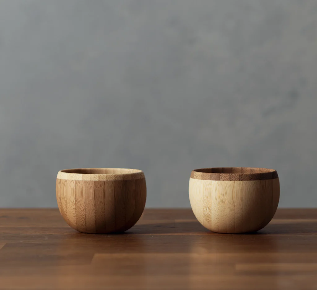 大口注文・法人のお問い合わせはこちら天然孟宗竹を削り出して作られた、ころんとした愛らしいシルエットが特徴のペアおちょこです。