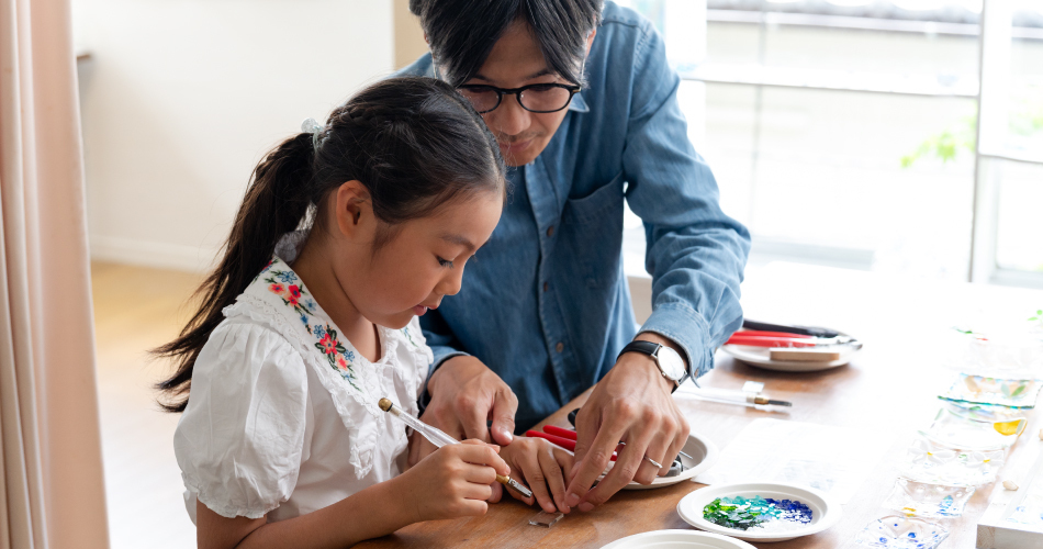 例えば、親子で楽しめるガラスアート体験を。色とりどりのガラスを切ったり削ったり並べたりしながら、世界にひとつだけの作品をつくります。自然に囲まれた工房で2人で没頭する時間は、かけがえのないひとときです。