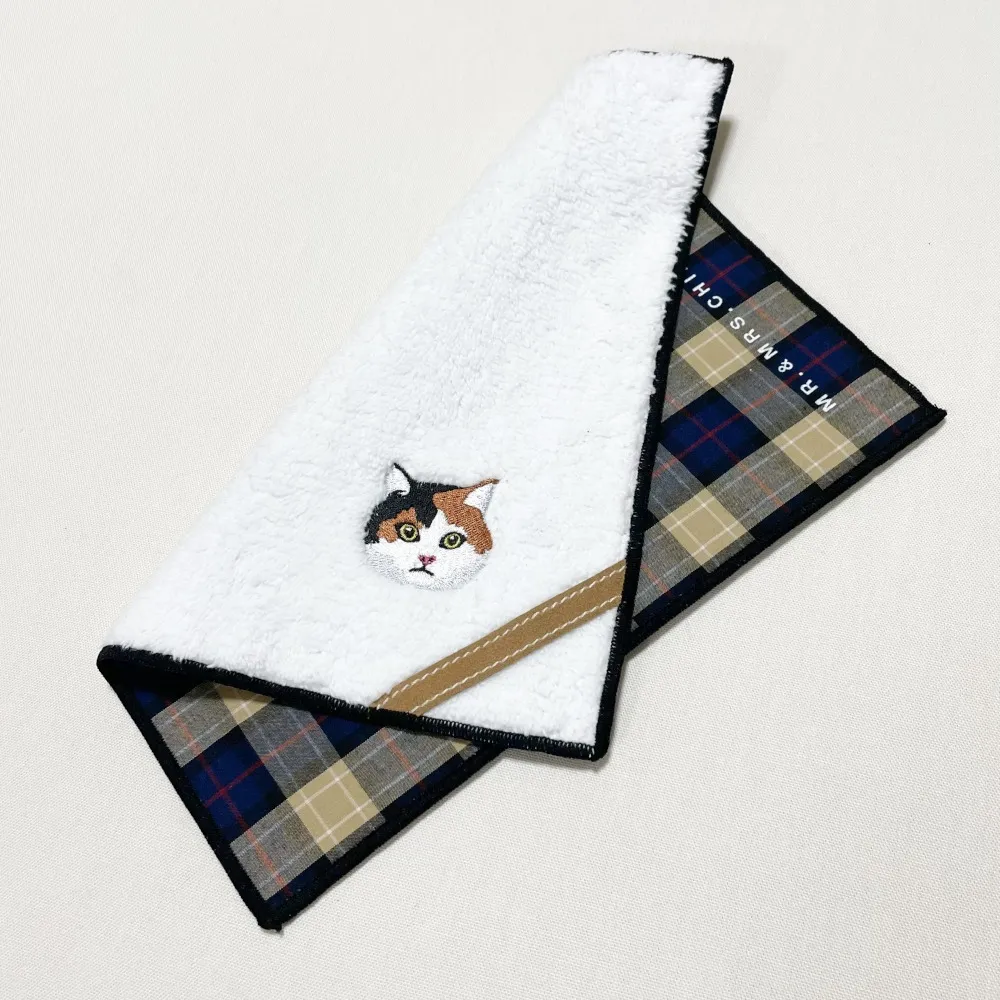 表はオリジナルのマイクロファイバーボアに犬・猫の刺繍が映えます。 裏は浜松や播州の先染めの生地になっています。 タータンチェックやストライプなど、ボアと柄のありそうでなかった組み合わせです。
