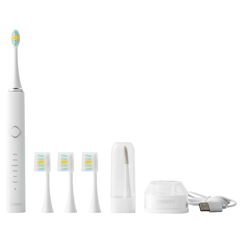 | 付属品 | 充電器台(USBケーブル)・ブラシヘッド4本(歯ブラシ3種・舌ブラシ)・本体用キャップ・ブラシ用ケース付 |