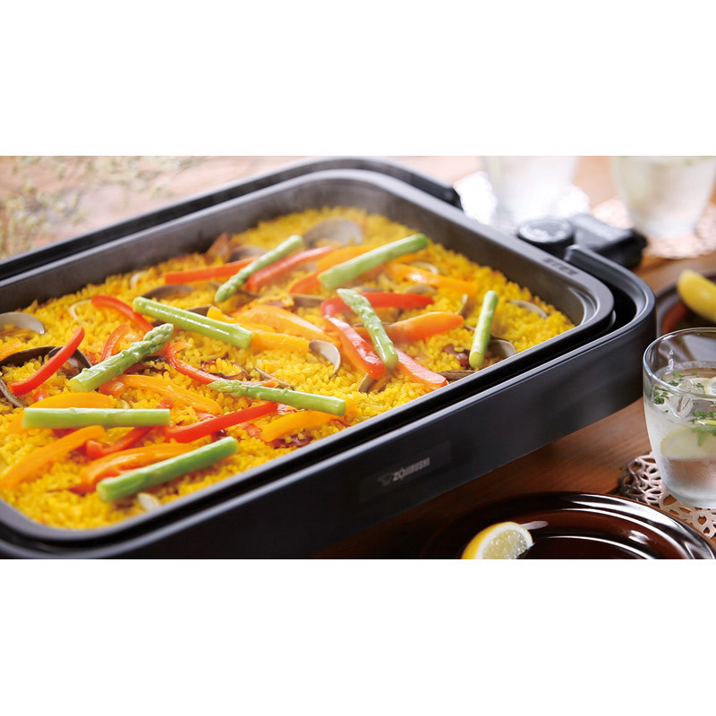 大口注文・法人のお問い合わせはこちら深さ3.5cmの「深型プレート」が、ホットプレート料理の常識を変えます。定番の焼肉やお好み焼きはもちろん、具材たっぷりのパエリアやブイヤベース、さらにはすき焼きまで、これ一台で驚くほど多彩なメニューに対応。深さがあるため食材がこぼれにくく、毎日の献立作りがもっとクリエイティブに楽しめます。