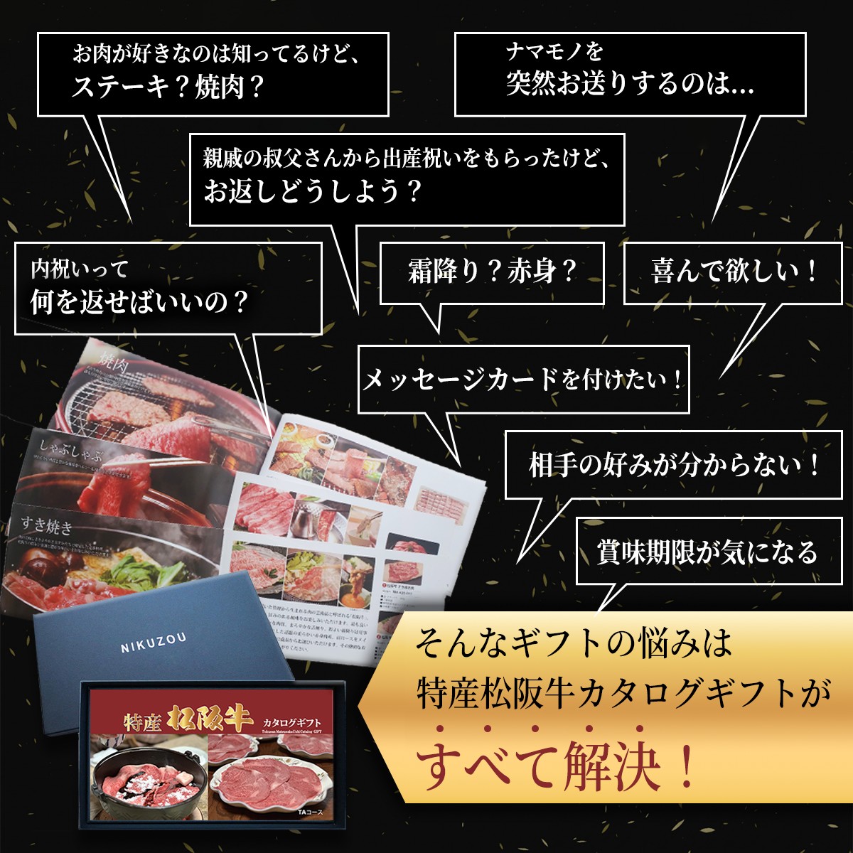 大口注文・法人のお問い合わせはこちら結婚祝いや出産祝いの内祝いとしてカタログギフトを贈りたいけど、予算内でというお客様からのご意見から商品化した選べるカタログギフトです。 松阪牛の中でも特に選び抜いた最高級のお肉をご用意いたしました。