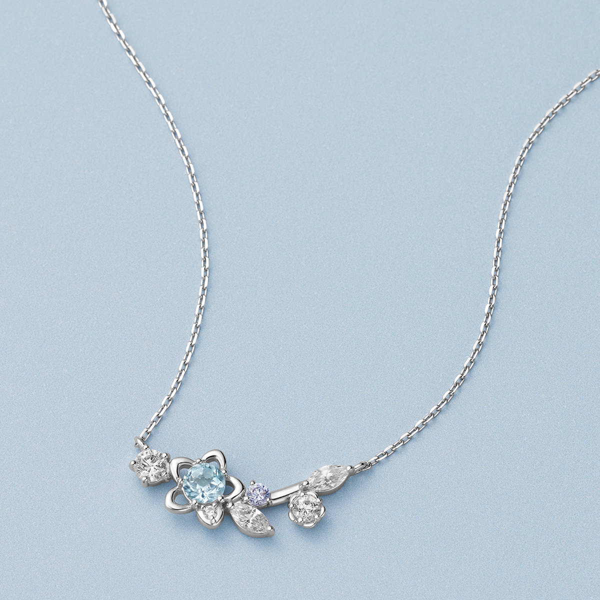 大口注文・法人のお問い合わせはこちらふわりと香る春の便りが、新しい季節へ導いてくれる Spring Limited。 花々が寄り添い合う横長のラインに、ネモフィラを象徴する優しいブルートパーズが輝くネックレス。