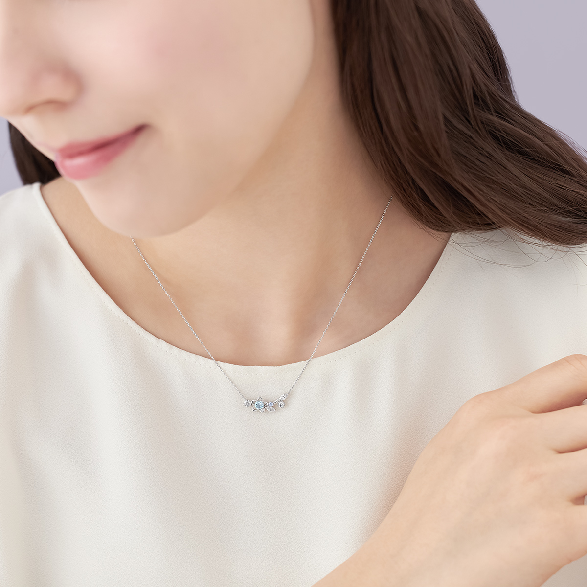 ふわりと香る春の便りが、新しい季節へ導いてくれる Spring Limited -Floral notes-春に咲くネモフィラをモチーフにしたネックレス。ネモフィラは「どのような環境でも成功する」という春の季節にぴったりな花言葉を持っています。花々が寄り添い合う横長のラインに、ネモフィラを象徴する優しいブルートパーズが輝きます。