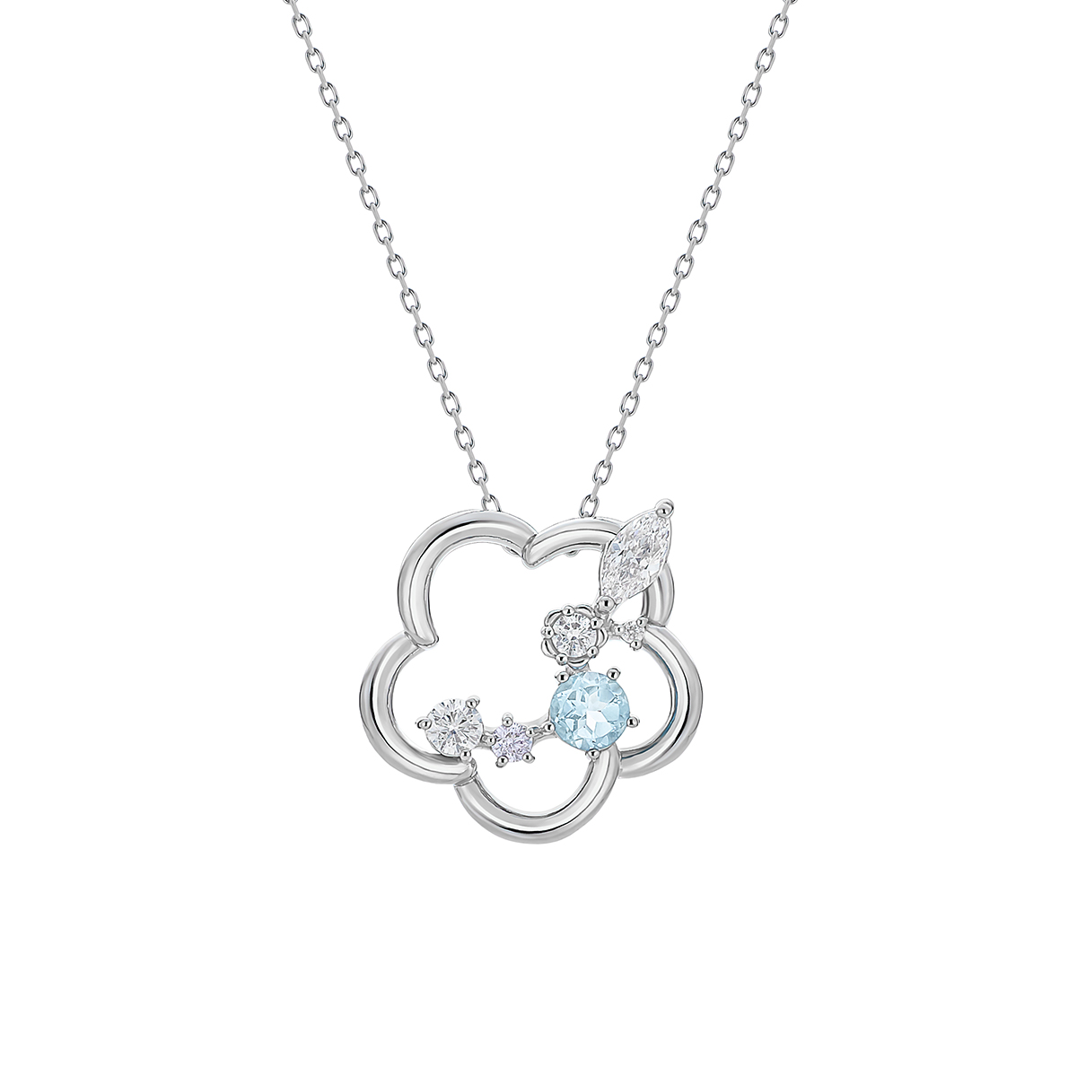 ネモフィラの花々が咲くように寄り添い合う、優しいブルートパーズが魅力的。シルバー+ロジウムコーティングの色味が胸元でみずみずしく輝きます。
