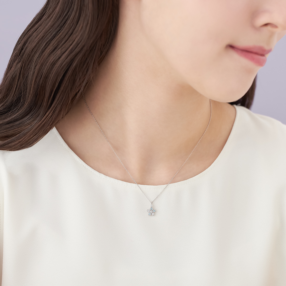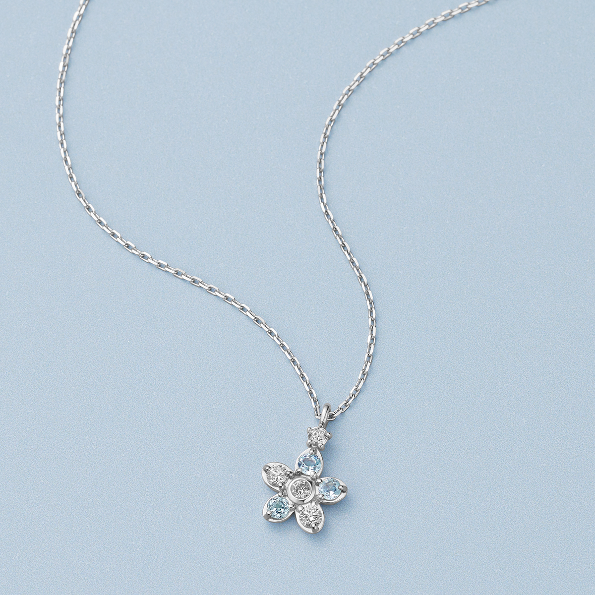 ふわりと香る春の便りが、新しい季節へ導いてくれる Spring Limited -Floral notes-春に咲くネモフィラをモチーフにしたネックレス。ネモフィラは「どのような環境でも成功する」という春の季節にぴったりな花言葉を持っています。ブルートパーズとクリアのキュービックジルコニアがきらめき、透明感のあるデザインで、シルバー+ロジウムコーティングの艶やかなカラーも魅力的です。