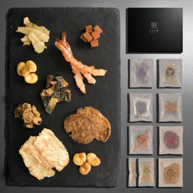 | 内容量/原材料 | ①ほろほろほどける 焼き塩ふぐ:12g マフグ(標準和名、石川県産)、食塩/ソルビトール、トレハロース、調味料(アミノ酸等) ②うにの旨味凝縮 焼きうに:10g 塩うに(うに(カナダ産、アメリカ産)、塩、その他)、砂糖、卵、水あめ、魚肉、加工大豆粉、ゼラチン、本みりん、米粉、小麦粉、植物性たん白、食塩/調味料(アミノ酸等)、アルコール、トレハロース、増粘多糖類、加工でん粉、焼ミョウバン、保存料(ソルビン酸K)、リン酸塩(Na) ③ぷりっぷりの えび浜焼き:13g バナメイえび(ベトナム産またはインドネシア産)、砂糖、食塩/ソルビトール、調味料(アミノ酸) ④コリっとパクっと ばい貝くんせい:15g バイ貝(国産)、砂糖、食塩、米発酵調味料、調味酢、醸造酢、唐辛子/調味料(アミノ酸等)、ソルビトール、酸味料、グリセリン、酒精、保存料(ソルビン酸K)、甘味料(ステビア、カンゾウ)、香辛料抽出物、(一部に大豆を含む) ⑤ちびちび食べる さばジャーキー:15g さば(石川県産)、オリーブオイル、ビーフ調味料、食塩/調味料(アミノ酸等)、(一部に小麦・乳成分・牛肉・さば・大豆・鶏肉・豚肉を含む) ⑥生姜香る、かわはぎ生姜:14g かわはぎ(ベトナム産)、砂糖、生姜、調味酢、食塩、胡椒/調味料(アミノ酸)、ソルビトール、トレハロース、酸味料 ⑦むきそら豆 わさび味:50g そら豆(オーストラリア)、植物油脂、デキストリン、食塩(食塩、紅岩塩)、米発酵調味料、水飴、魚介エキス、酵母エキス、昆布エキス/香辛料抽出物、(一部に小麦・さばを含む) ⑧むしゃぶり まぐロール:約15g マグロ(ベトナム)、砂糖、食塩/ソルビット、調味料(アミノ酸) ⑨まるでスナック むきそら豆:50g そら豆(オーストラリア)、植物油脂、食塩(食塩、紅岩塩) |