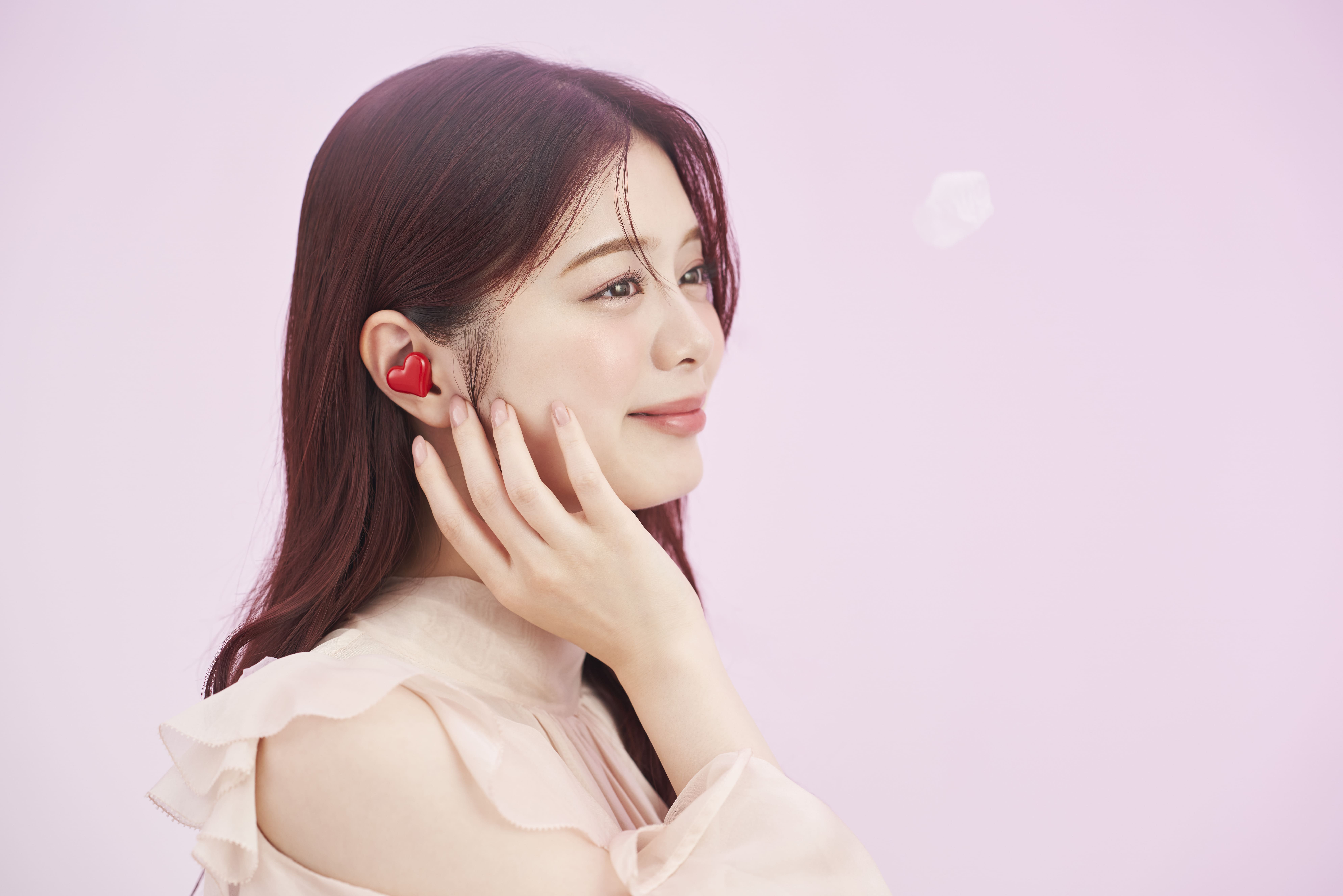 大口注文・法人のお問い合わせはこちら光沢感のある特徴的なハート形状がまるでアクセサリーのように耳にフィット。 装着した時に可愛らしく見えることを第一に考えてデザインされながらも、アクティブノイズキャンセリング機能&重低音モード搭載でしっかり高音質を実現した完全ワイヤレスイヤホンです。
