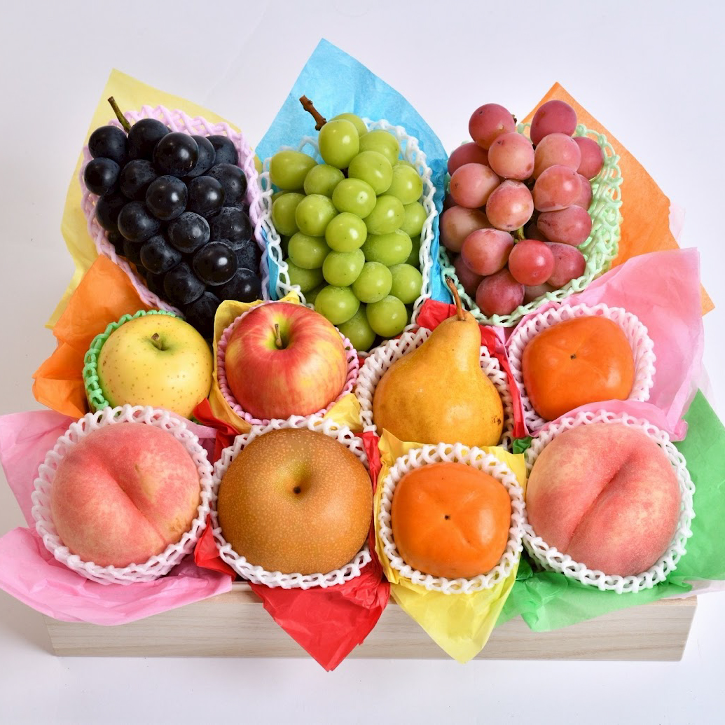 メロンだけでなく、その時期に一番美味しい旬のフルーツを10〜14品種も贅沢にセレクト。熟練の職人が選び抜いた果実を、桐箱に丁寧に詰め合わせました。蓋を開ける瞬間の高揚感、そして色とりどりの果実が織りなす美しさは、まるで芸術作品のようです。