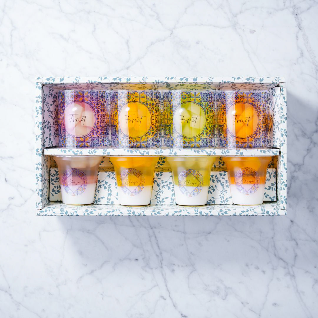 8個入 ・三層ゼリー白桃、黄桃、洋梨、マンゴー ×各1個 ・果実ゼリー白桃、黄桃、洋梨、マンゴー ×各1個