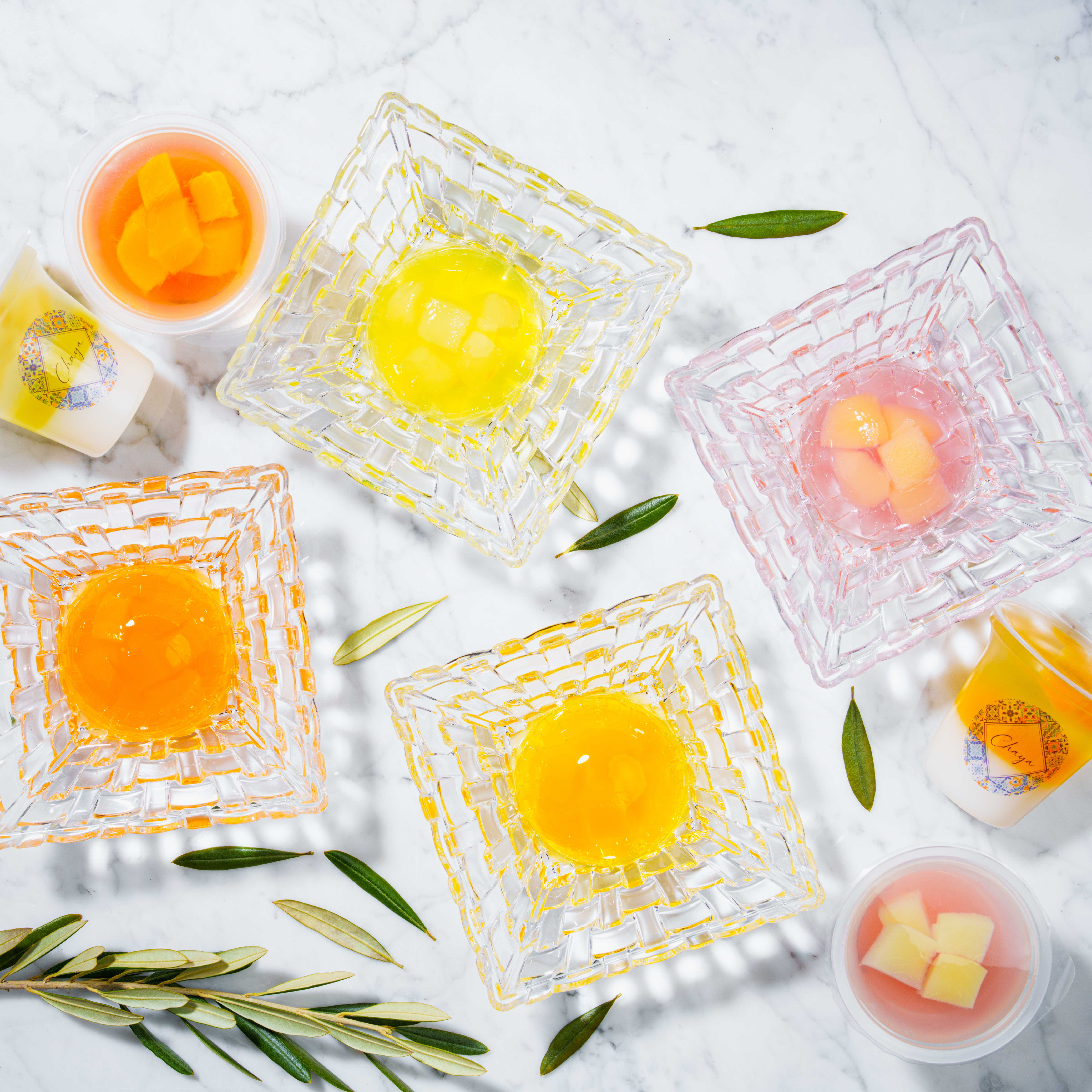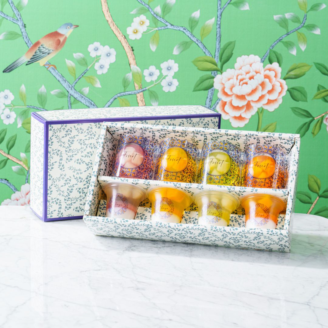 大口注文・法人のお問い合わせはこちら2つの涼菓を楽しめるゼリー詰合せセット。白桃・黄桃・マンゴー・洋梨の彩り豊かな4種を揃え、贈り物や夏のデザートにも最適です。アルコール不使用でお子様にも安心してお召し上がりいただけます。