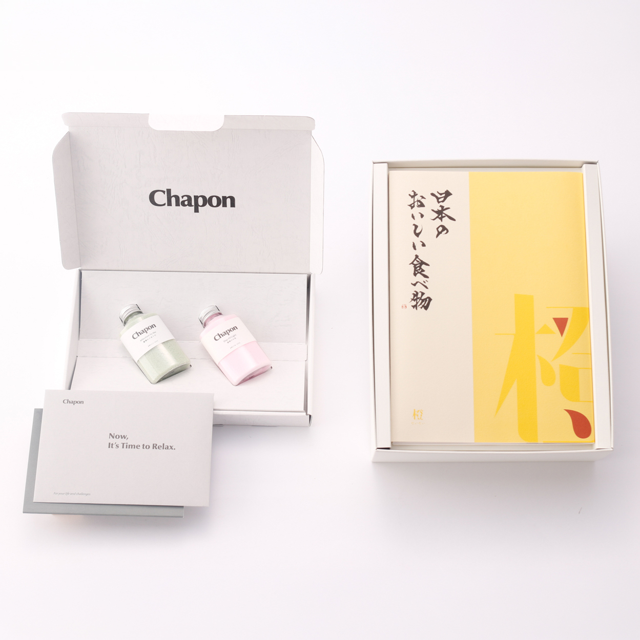 カタログギフト「日本のおいしい食べ物」と選べるChaponの入浴剤2本セットが、一つの専用BOXに入ったギフトセット。