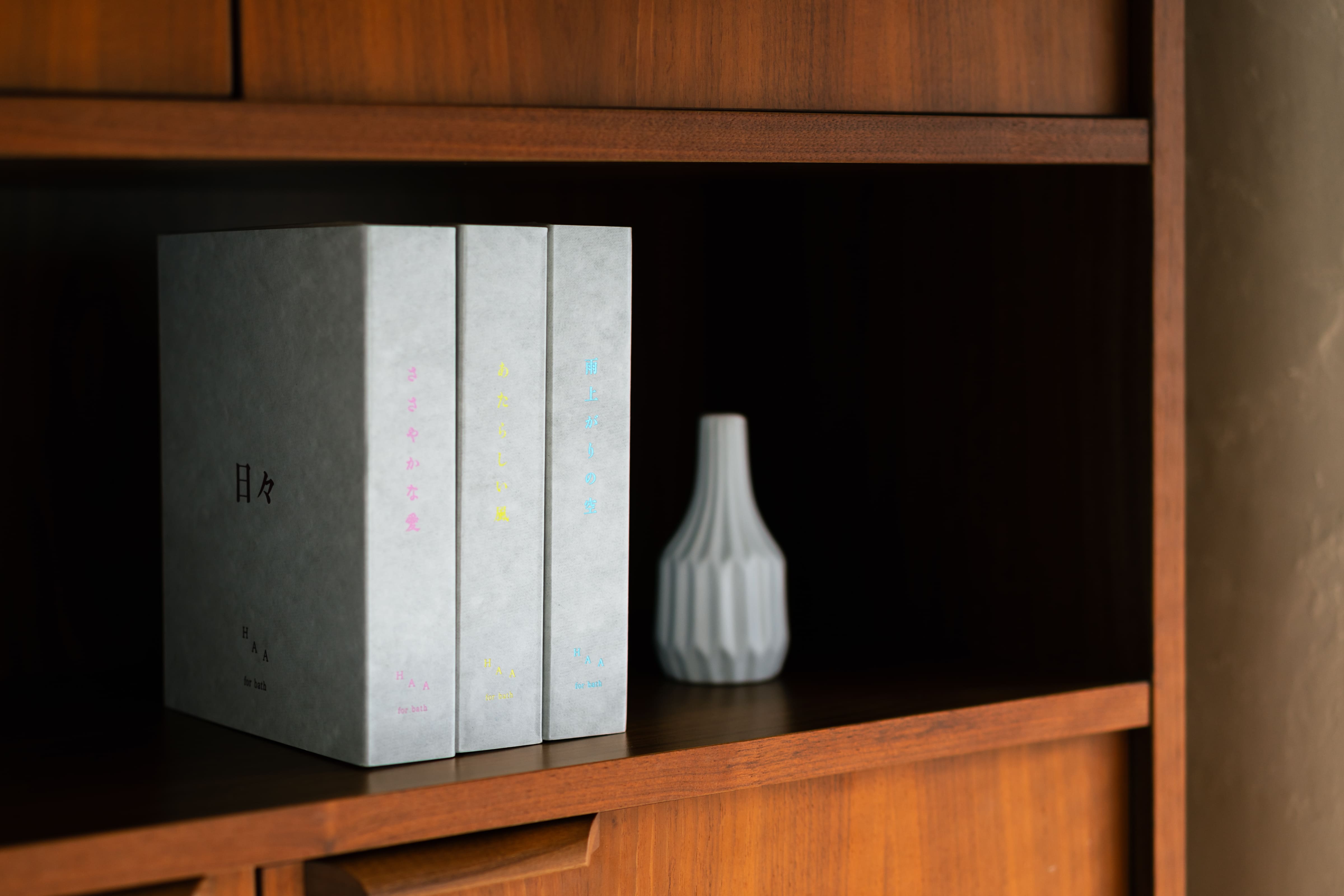 本棚に入れても違和感のないデザイン。 ゆっくりとお風呂に入りたいときに、そっと取り出して、その日の気分で包み紙の色やタイトルを選んでお楽しみください。
