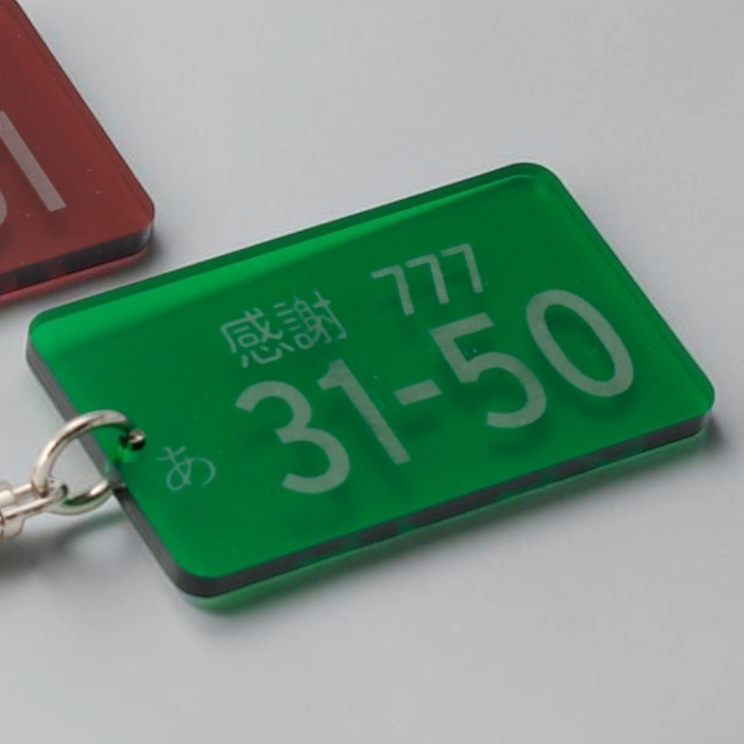 愛車への愛着が深まる、ナンバープレートを再現したアクリルキーホルダーです。透き通るクリアカラーの赤と緑が美しく、光の加減で豊かな表情を見せます。お好みの地名や数字を指定できるため、記念日や父の日ギフトに最適です。軽量かつ丈夫な作りで、鍵やバッグのアクセントとして存在感を放ちます。