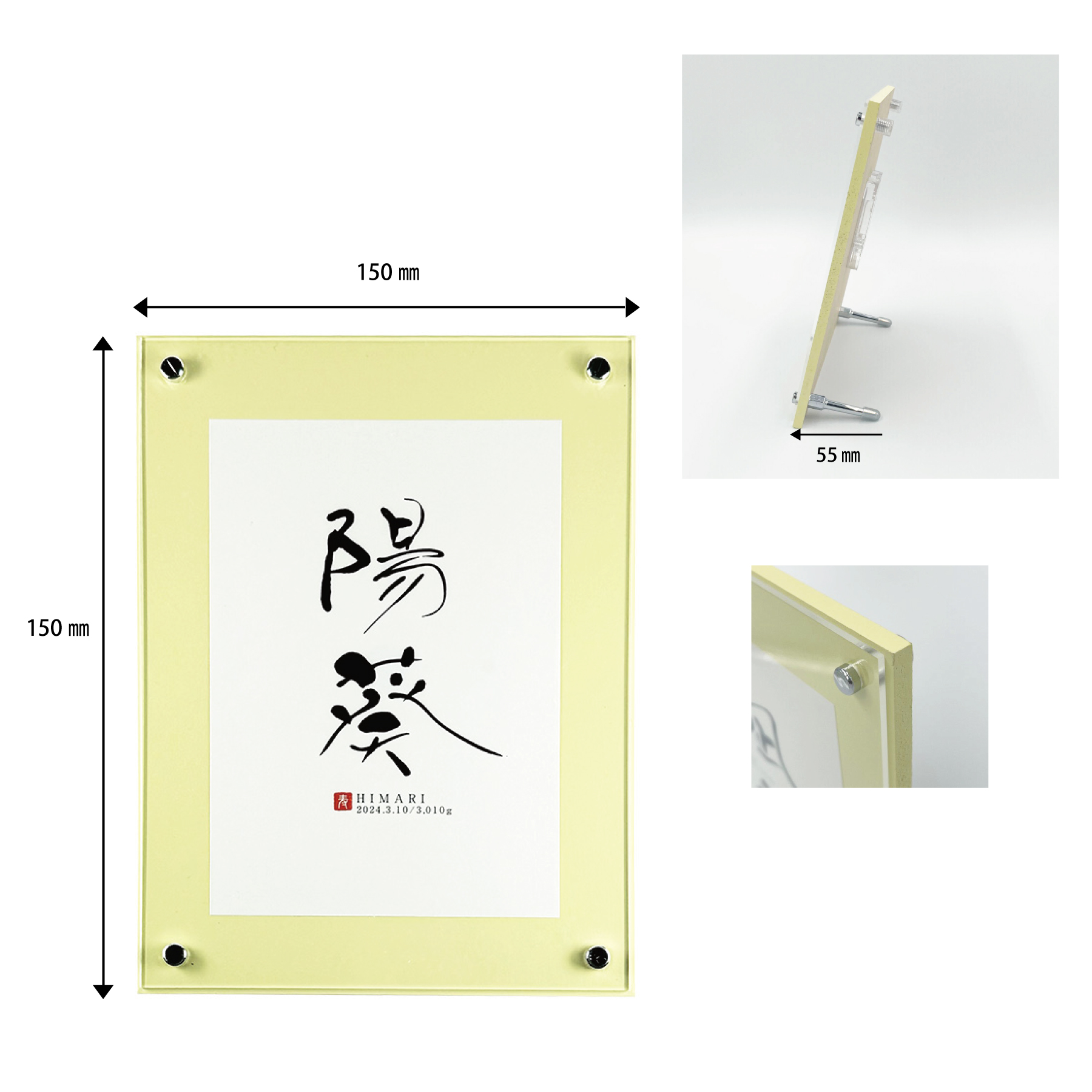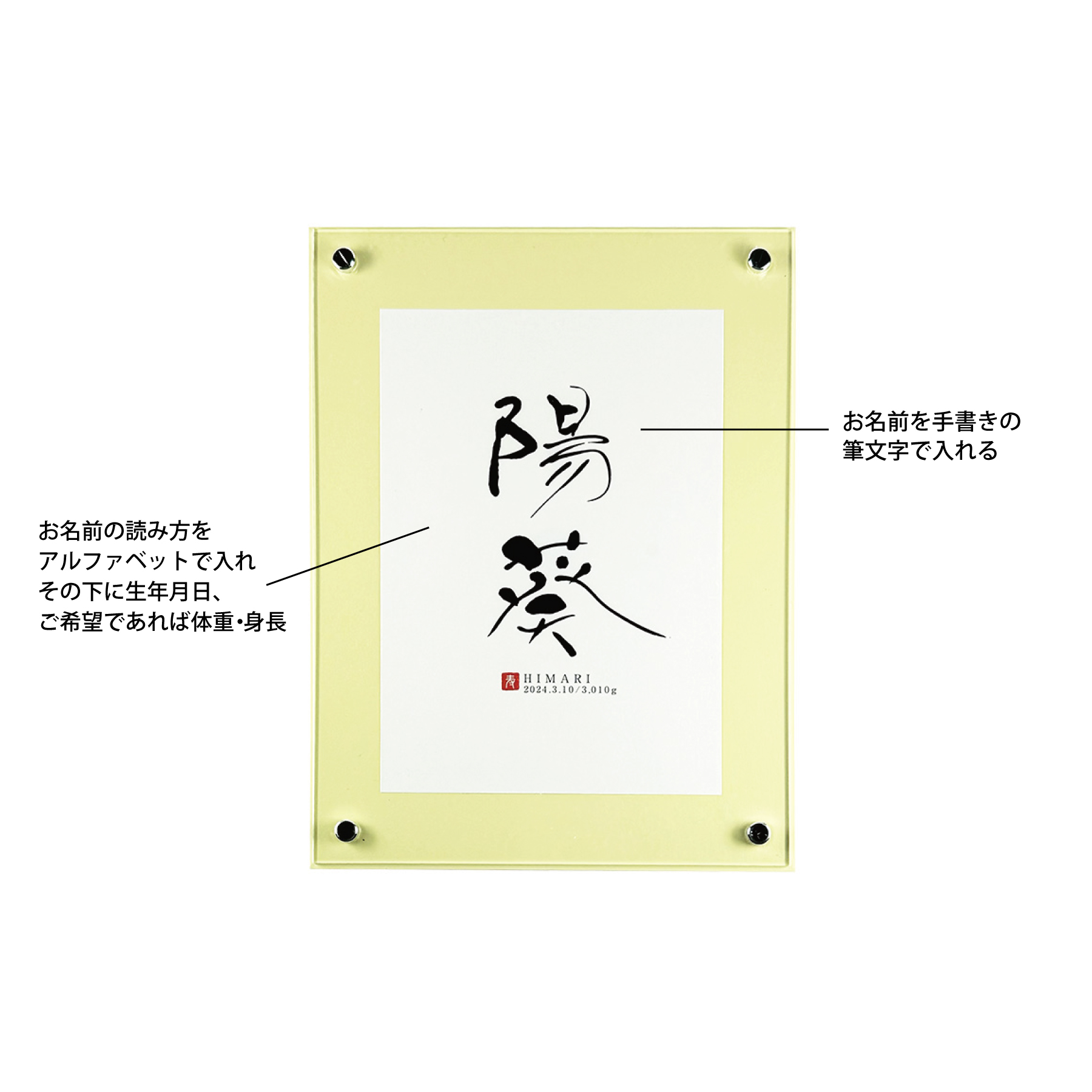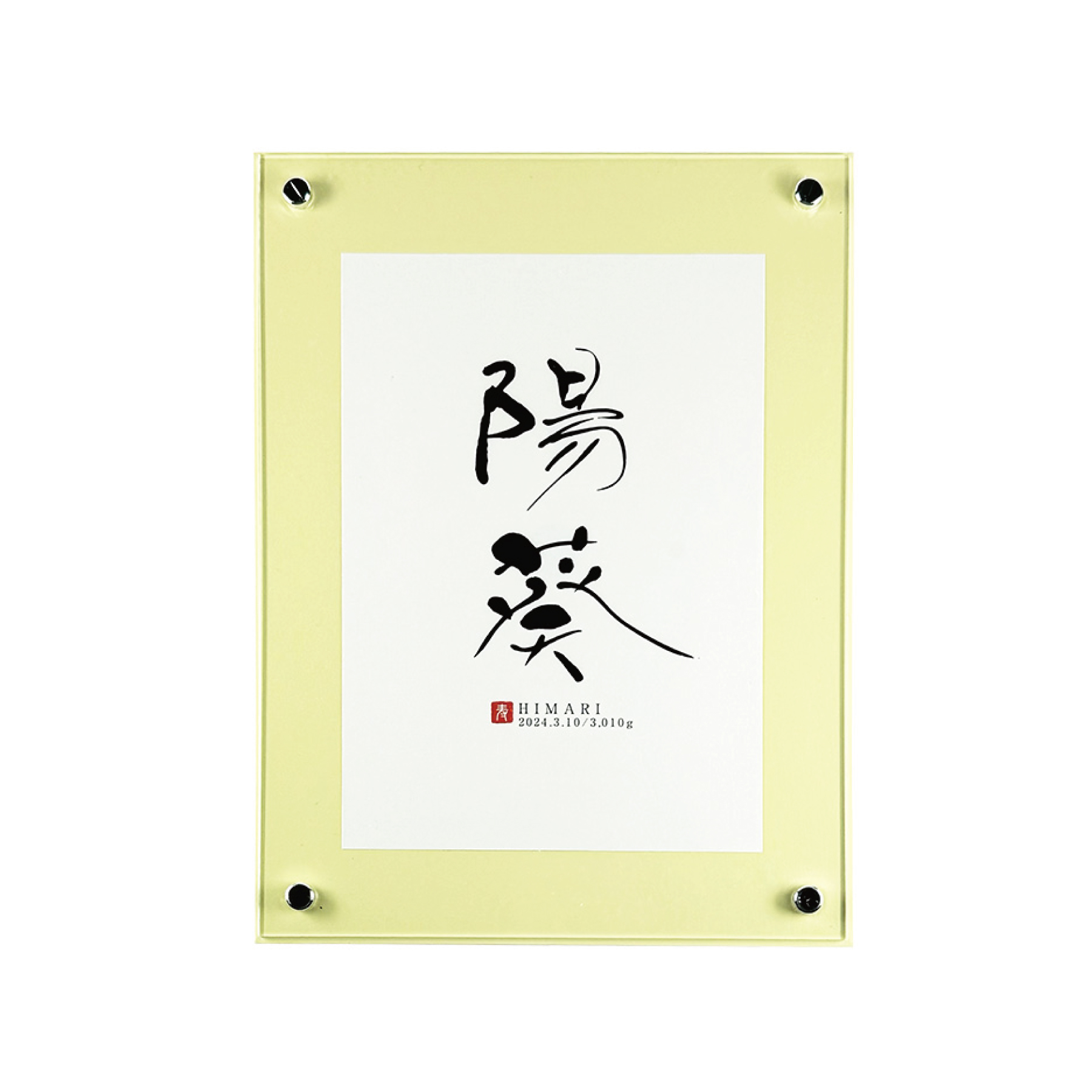 お名前は、お子様への大切な贈り物です。そのお名前を筆文字にしたため、デザインした命名フレーム。優しい風合いのボードに高級感のあるアクリルを合わせた、カジュアルな中にもインテリア性の高いものになっています。世界にたった一つのオリジナルフレームは、出産祝いや内祝いにも喜ばれる商品です。