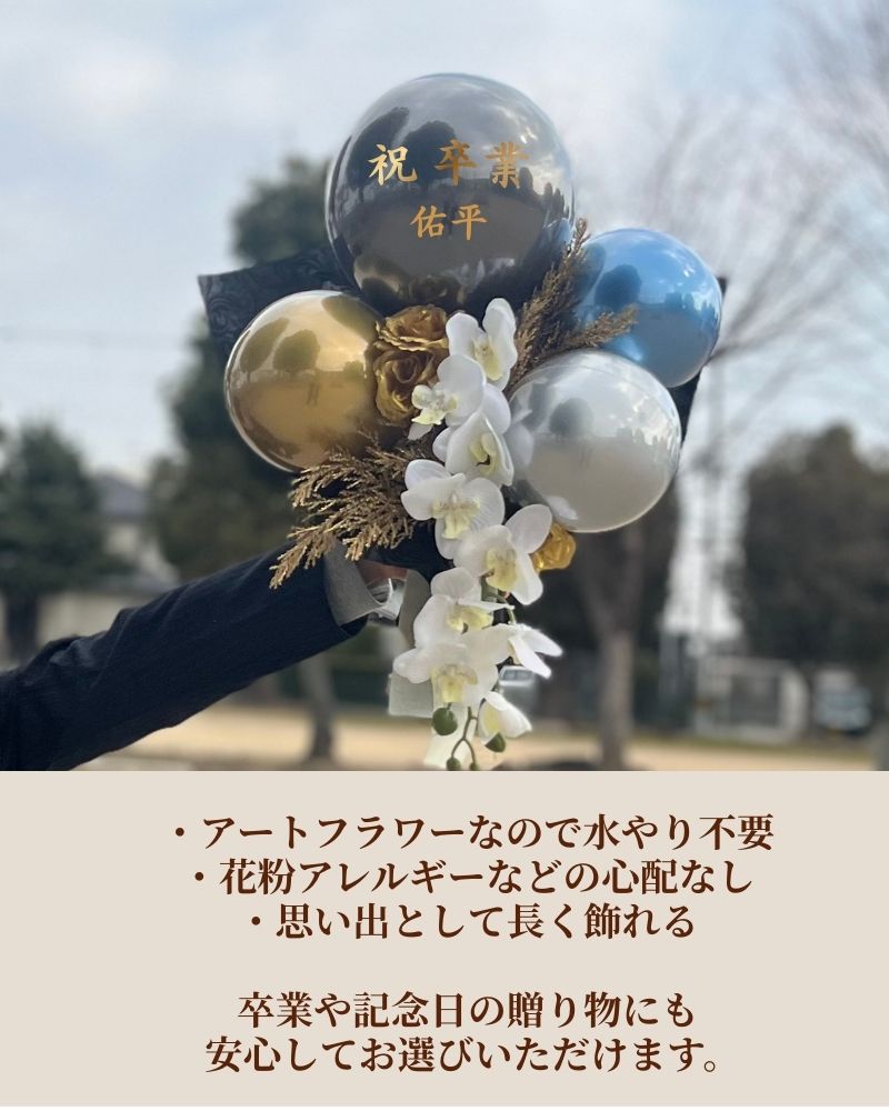 プレゼントに人気のバルーンブーケ。無料名入れで、おめでとうの気持ちを込めた特別な贈り物に。アートフラワーを使用した上品な仕上がりのブーケは、生花とは異なりお手入れも不要で数か月間お楽しみいただけます。