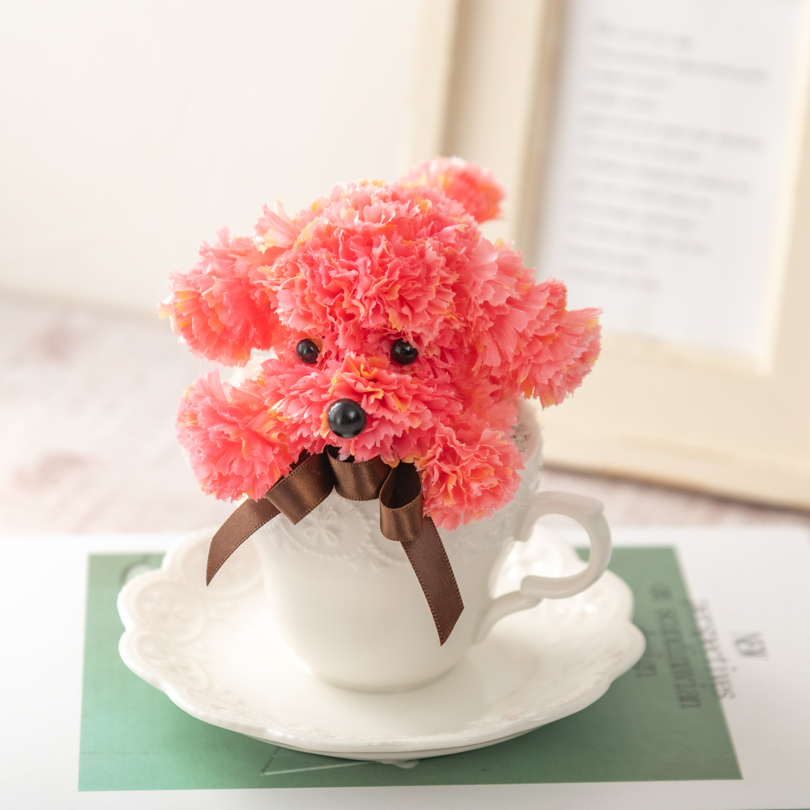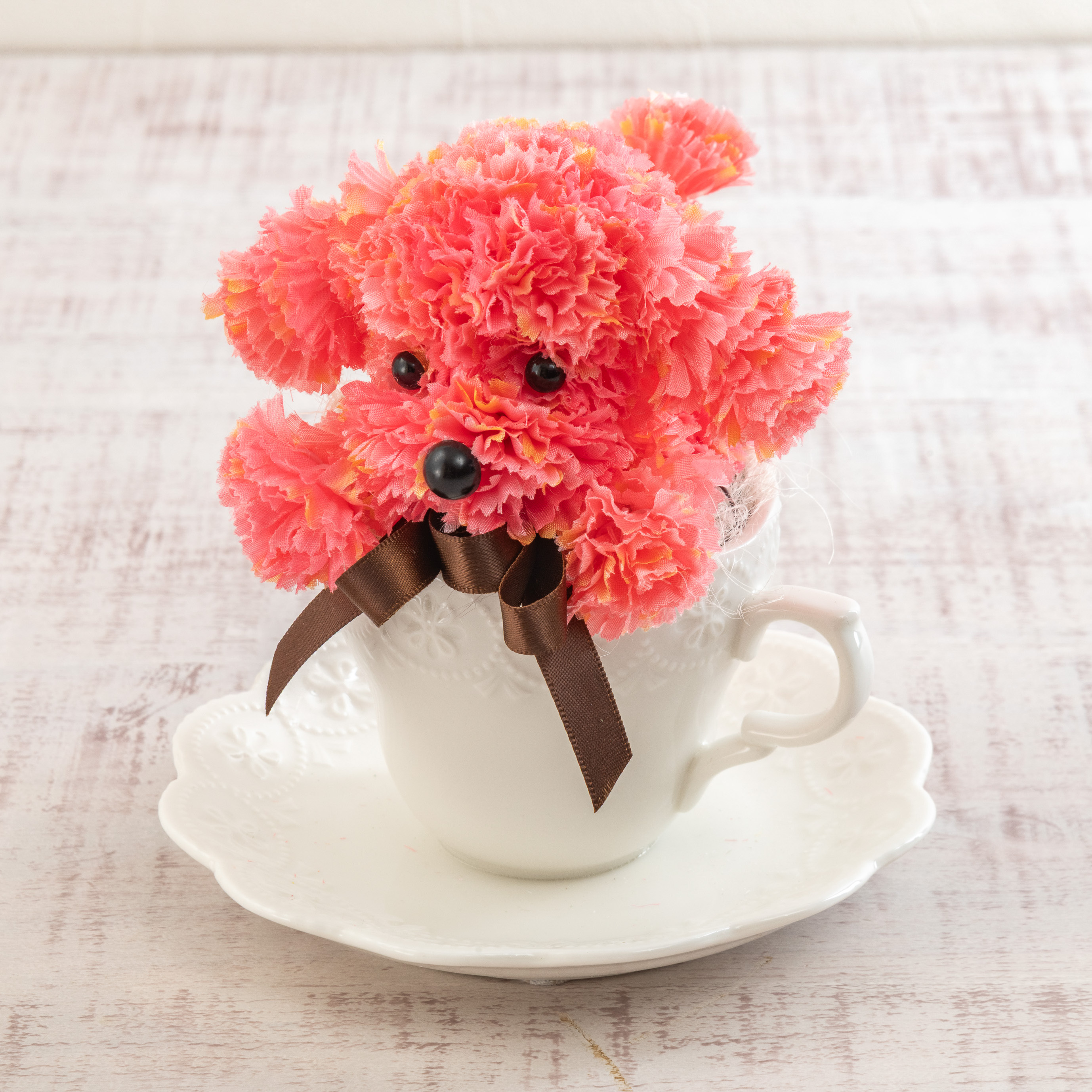 プードルのふわふわとした毛並みは、アーティフィシャルフラワーのカーネーションで丁寧に表現されています。幅・奥行き約13cmとコンパクトなサイズで、リビングのテーブルや玄関先など飾る場所を選びません。