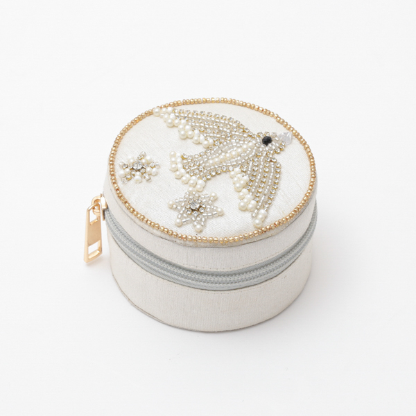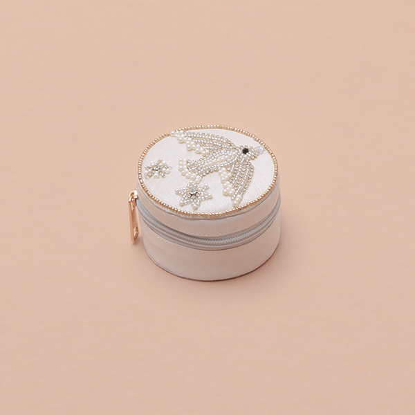 色鮮やかなビーズ刺繍が施されたファブリックシリーズ。華やかなビーズ刺繍は全て職人の手作業により作られています。長年人気の鳥刺繍を用いたアクセサリー類を収納するのに最適な筒形ケースです。