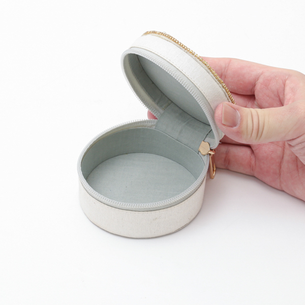 コロンとしたフォルムが可愛らしい、直径8.5cmの手のひらサイズの筒形ケース。ファスナーで大きく開閉できるため、中身が見やすく出し入れもスムーズです。裏地には肌触りの良い綿100%の素材を使用しており、お気に入りのリングやピアス、ネックレスなどのアクセサリー類を大切に保管していただけます。