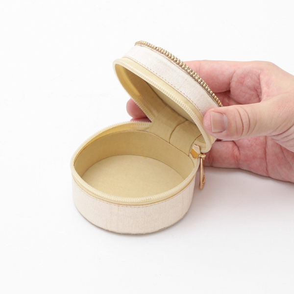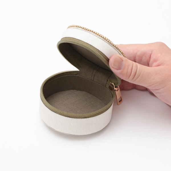 コロンとしたフォルムが可愛らしい、直径8.5cmの手のひらサイズの筒形ケース。ファスナーで大きく開閉できるため、中身が見やすく出し入れもスムーズです。裏地には肌触りの良い綿100%の素材を使用しており、お気に入りのリングやピアス、ネックレスなどのアクセサリー類を大切に保管していただけます。