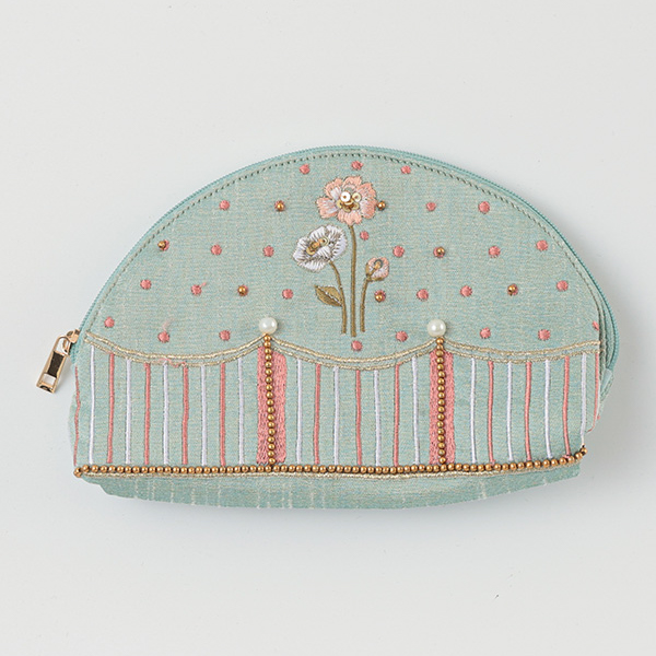 このポーチは、インドの伝統的な技法を用いた丁寧な手仕事で作られています。職人がひとつひとつ手作業で縫い付けたビーズは、機械生産にはない温もりと豊かな表情を持っています。光の加減で繊細にきらめく刺繍に、手作りならではの特別感を感じていただけるはずです。