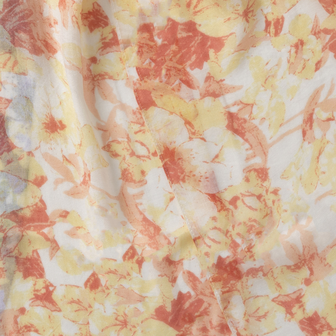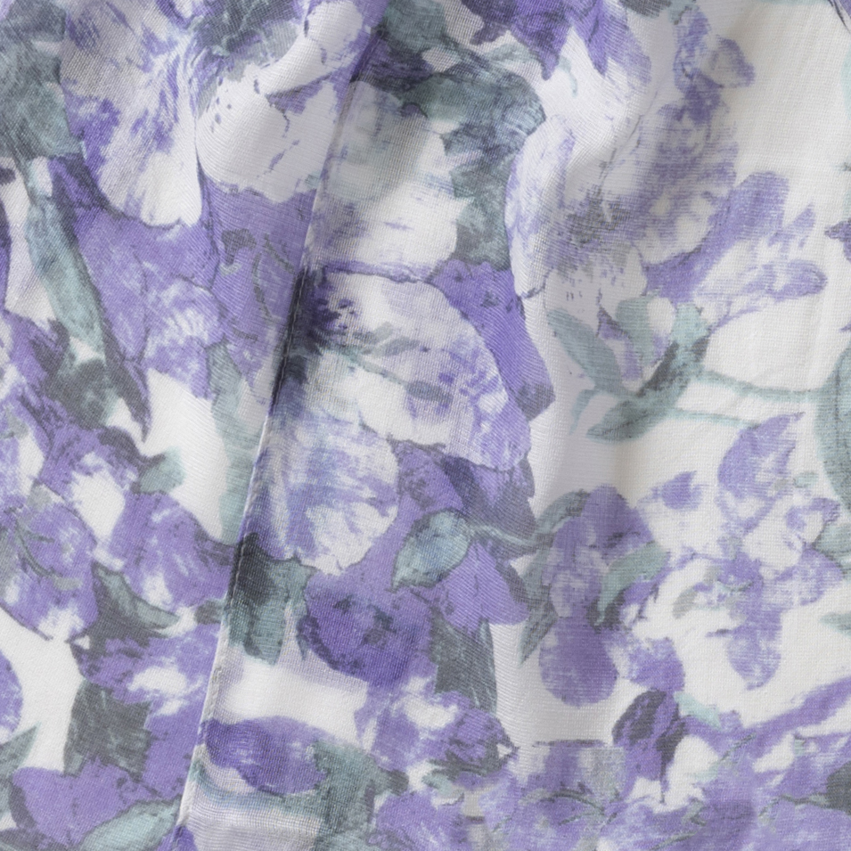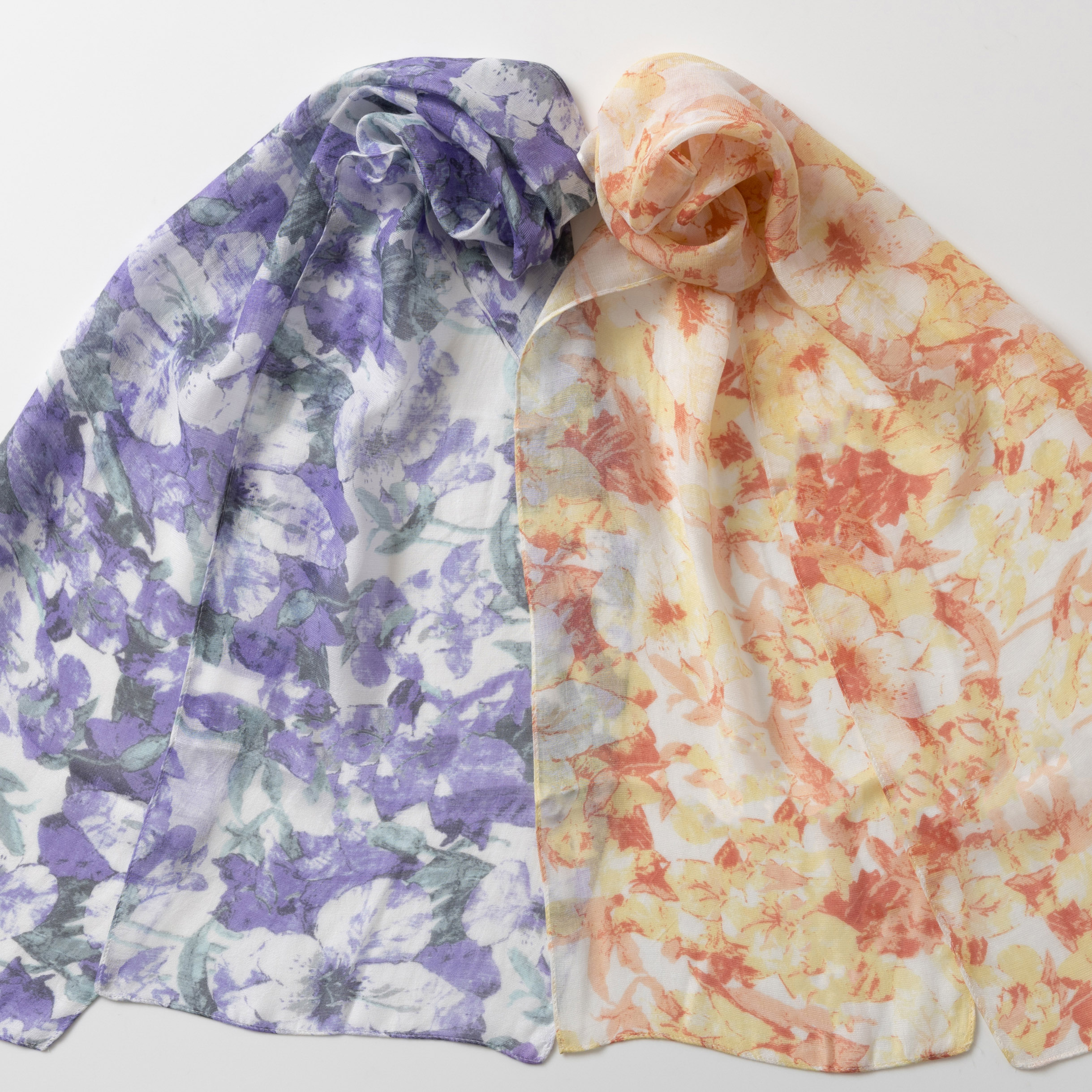 印象派の絵画を思わせる美しい花柄が、お顔周りを華やかに彩るショール。絹とレーヨンをブレンドした生地は、さらりととろみのある素材感が魅力です。「パープル」または「オレンジ」より、お好きなカラーをお選びいただけます。大切な方へ笑顔を届ける、特別なギフトにいかがでしょうか。
