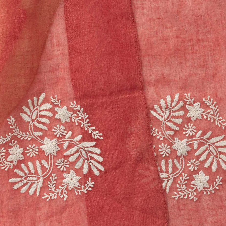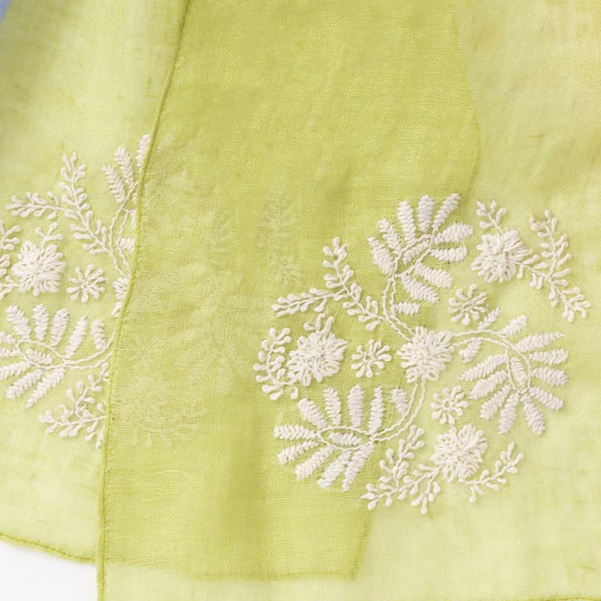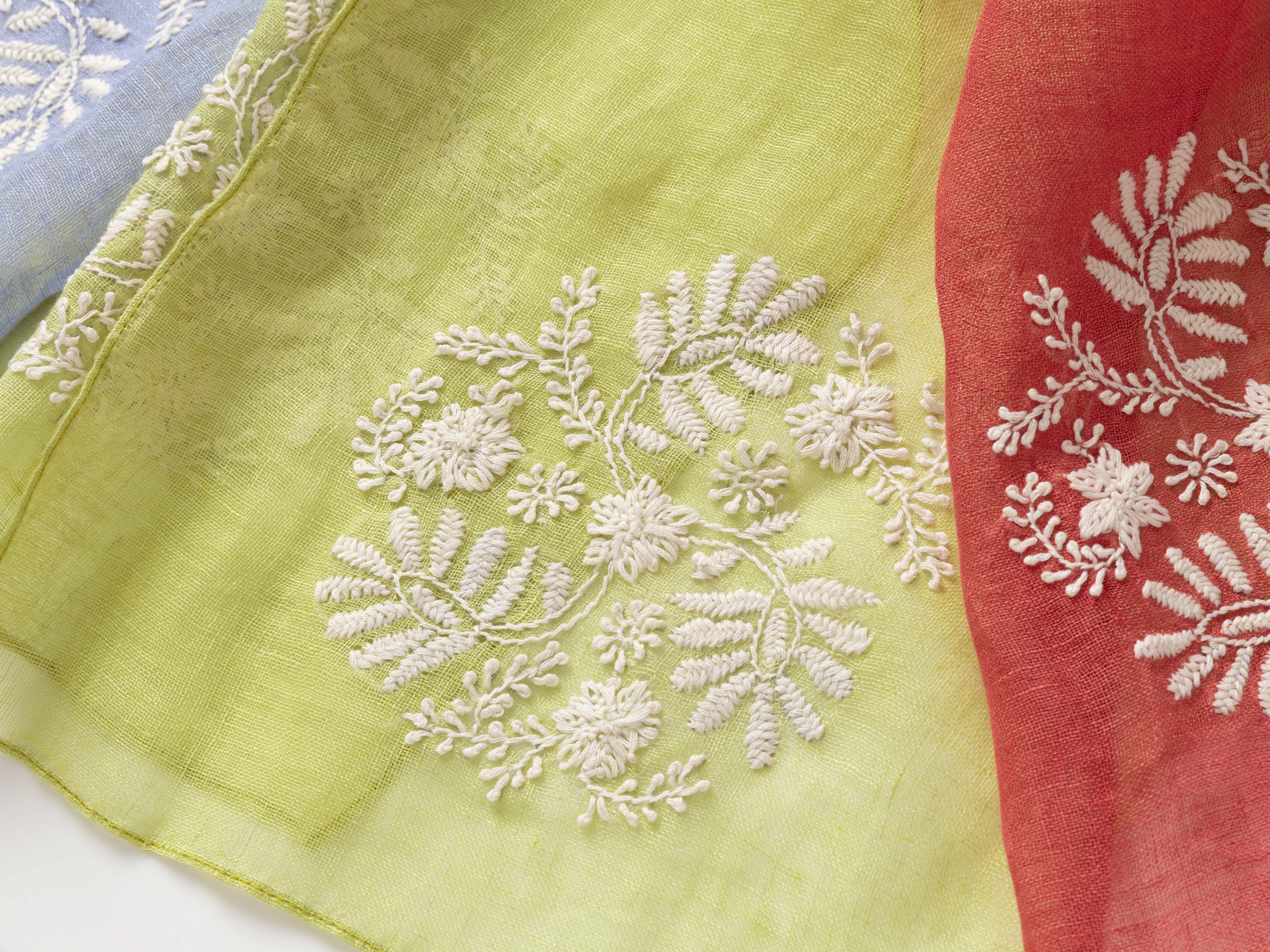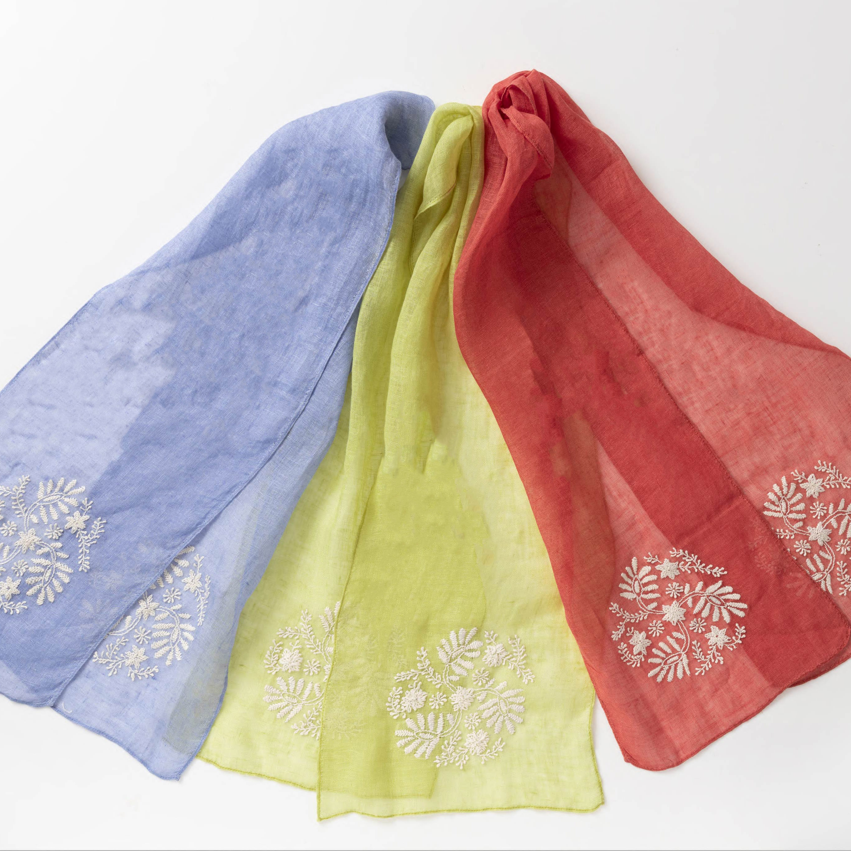 職人が手作業で可憐な花々を刺繍した、麻100%の上質なショール。通気性が良くさらっとした使い心地。使うごとに肌になじむ特性を持っているので、長く楽しんでいただきたいショールです。「ブルー」「グリーン」「レッド」より、お好きなカラーをお選びいただけます。