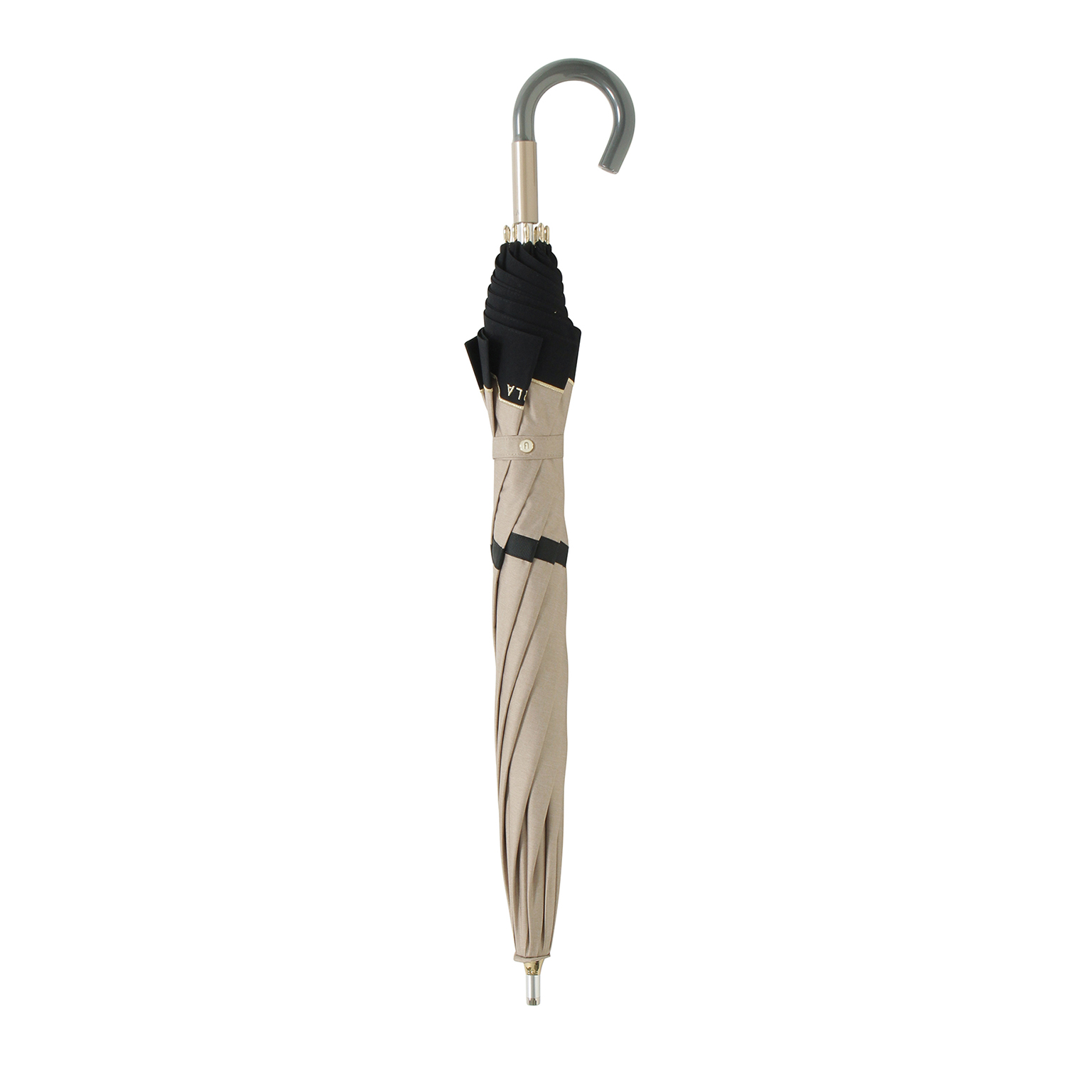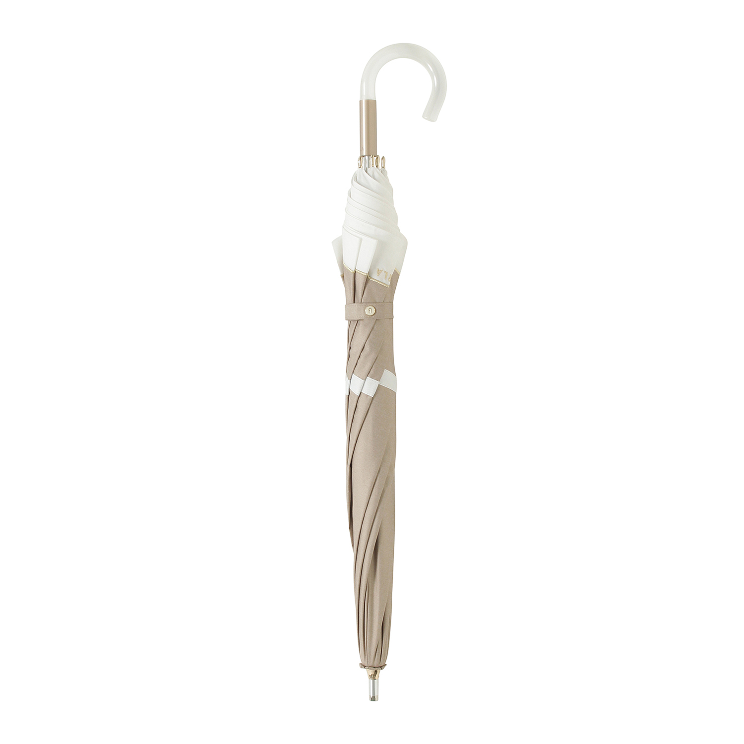 上品なバイカラーとさりげないゴールド刺繍が目を惹く、遮光率100%の晴雨兼用日傘です。軽やかな持ち心地で、使いやすさも抜群です。母の日や誕生日のギフトにおすすめです。