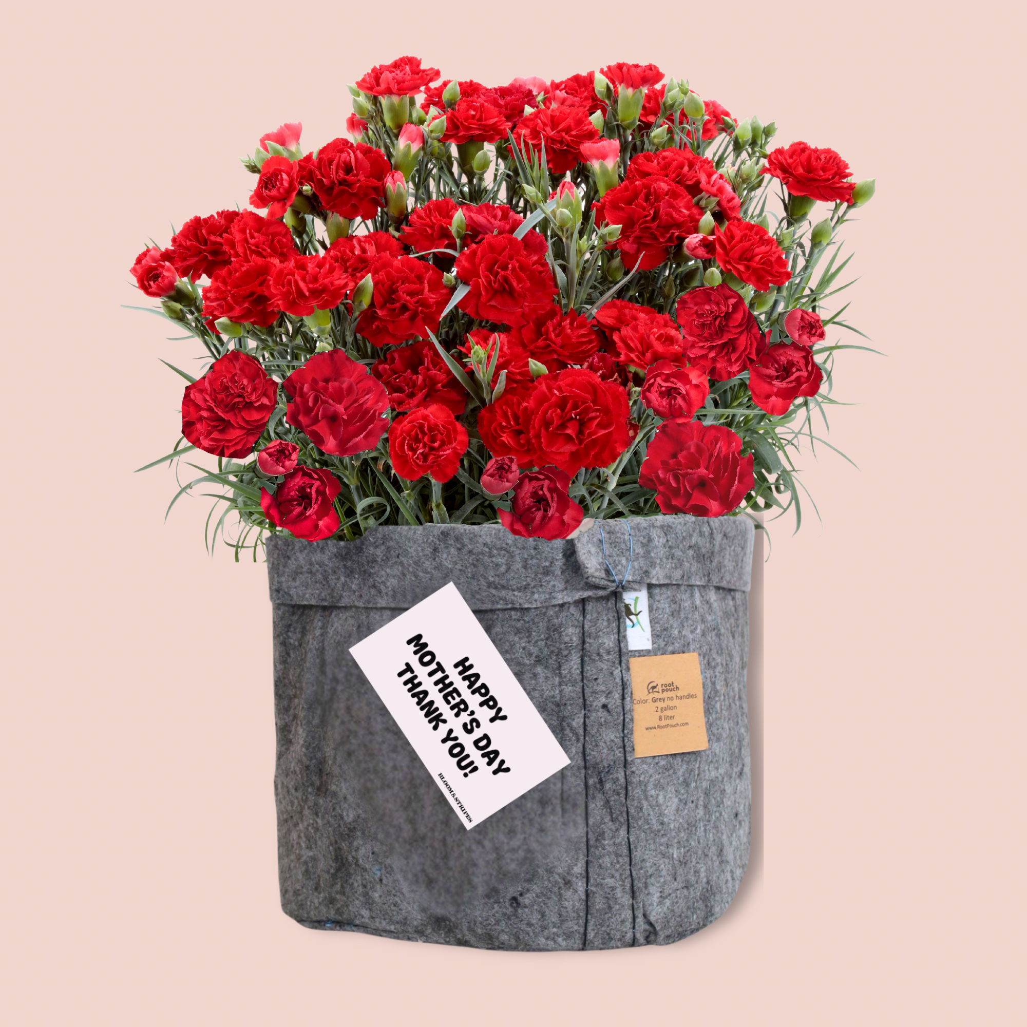 大口注文・法人のお問い合わせはこちら【5/7(木)~5/10(日)の期間内お届け】※配送日時はご指定いただけません。 色鮮やかなレッドのカーネーションは、とても上品な雰囲気です。大田市場の鉢物専門家とブルームストライプスのデザイナーが生産者までこだわって仕入れ、お母さまにお届けします。 ※商品の特性上、天候や生育状況により、写真と実際の商品で花の咲き具合や色合いなどが異なる場合がございます。その他材料やデザインが一部変更になる場合がございますのであらかじめご了承ください。