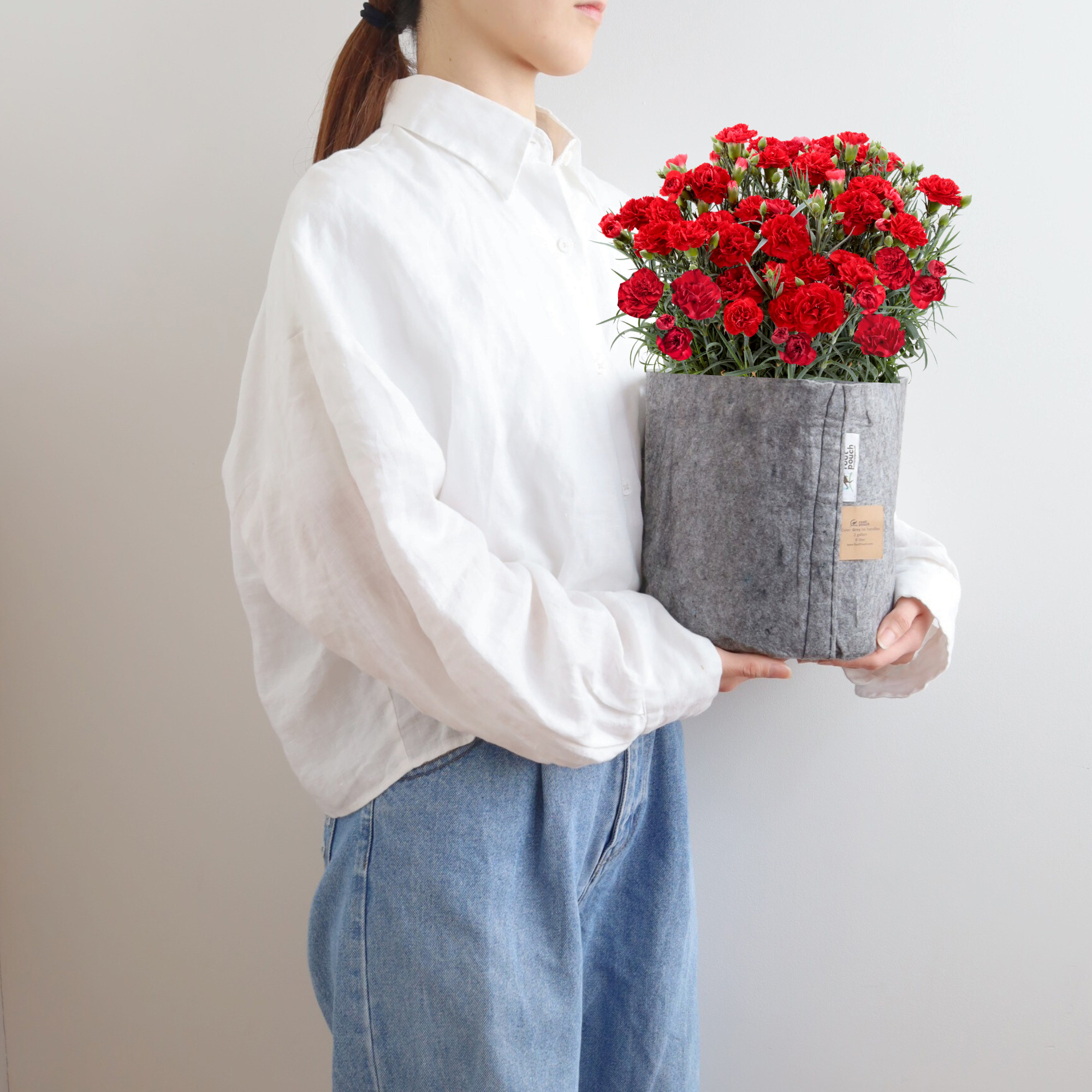 鉢カバーは見た目が可愛いだけでなく、環境に配慮した革新的な「ルーツポーチ」を採用。ペットボトルなどのリサイクル素材から作られたこの素材は、使用後は土に還る地球に優しい素材です。通気性と透水性に優れ、カーネーションが咲き終わった後は、お好みの草花や野菜を育てるポットとして再利用できます。